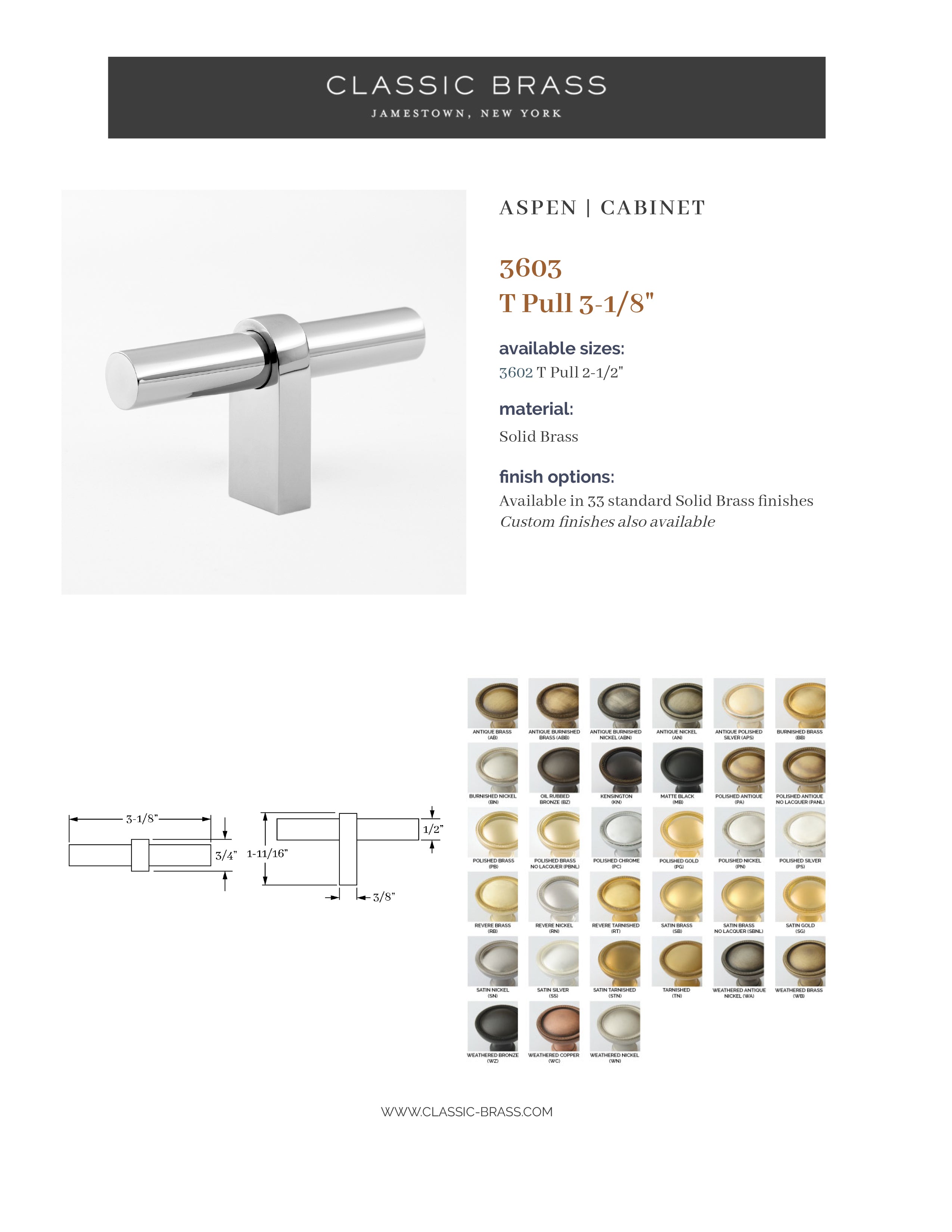 3603, T Pull - 3-1/8", Classic Brass Aspen Collection