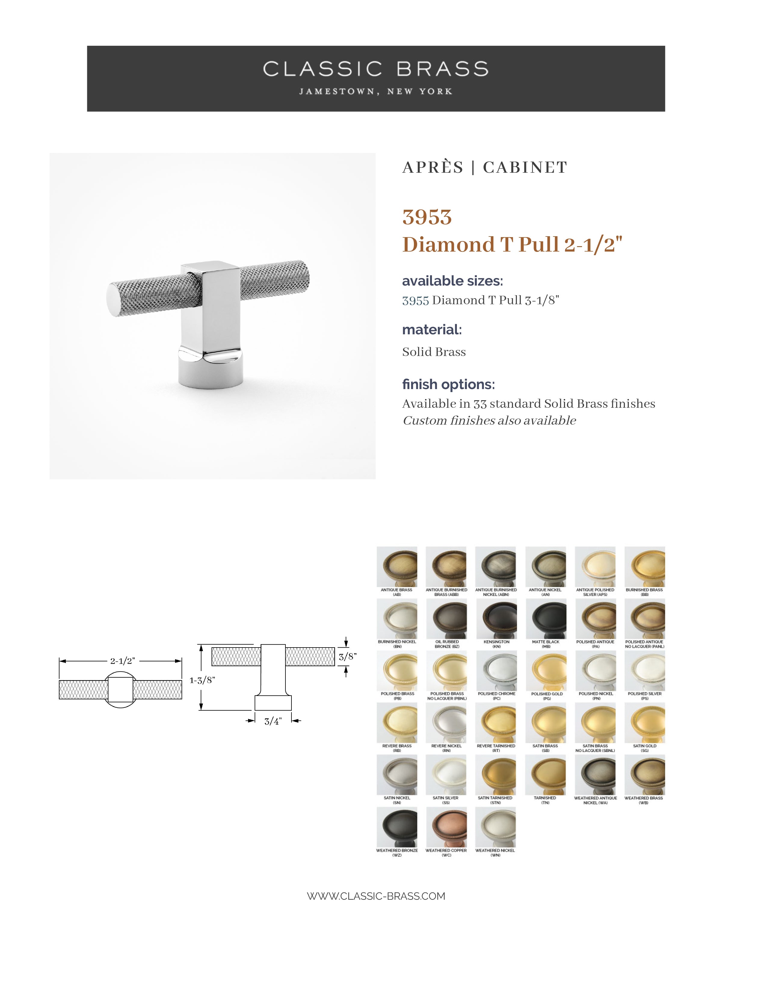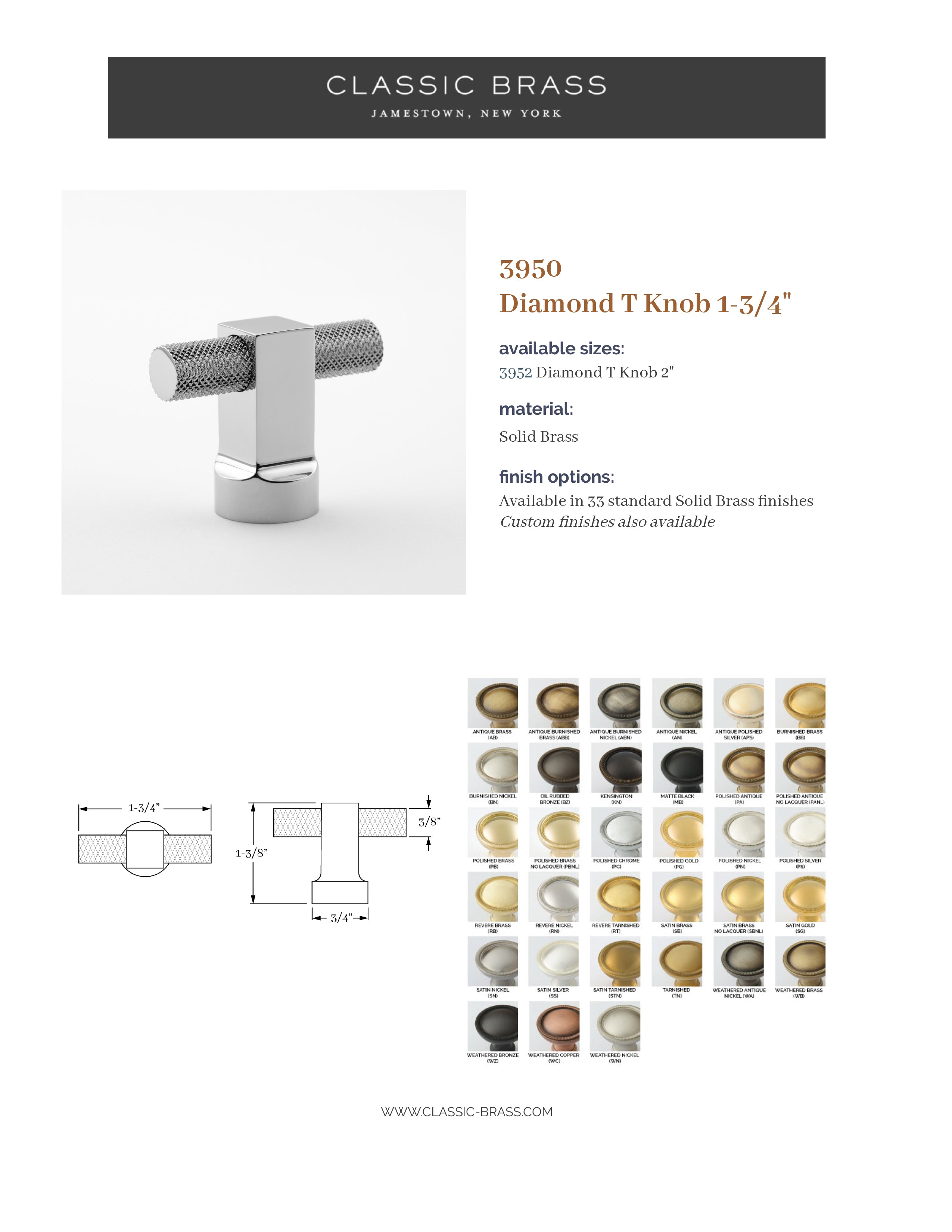 3950, T Knob - 1-3/4" Diamond, Classic Brass Apres Collection