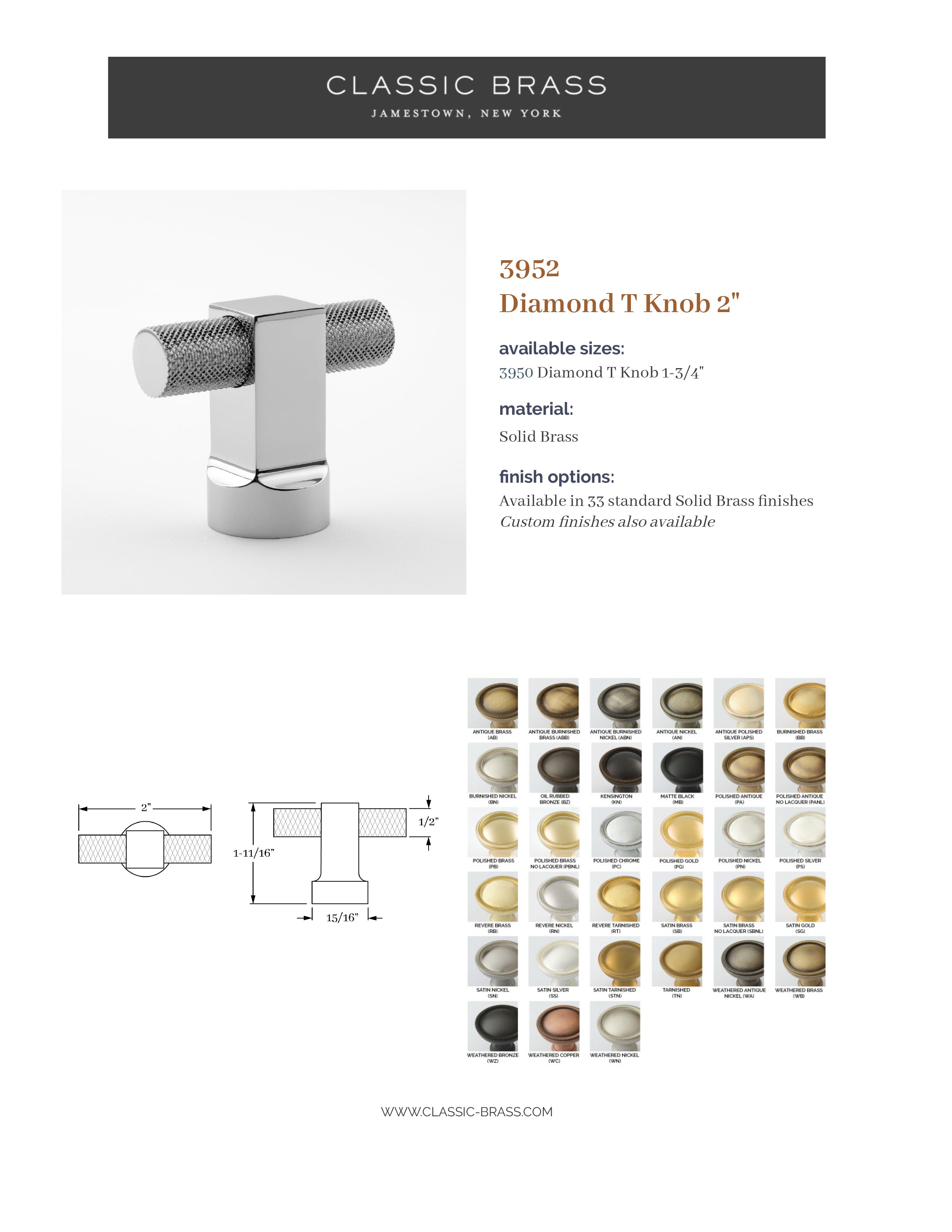 3952, T Knob - 2" Diamond, Classic Brass Apres Collection