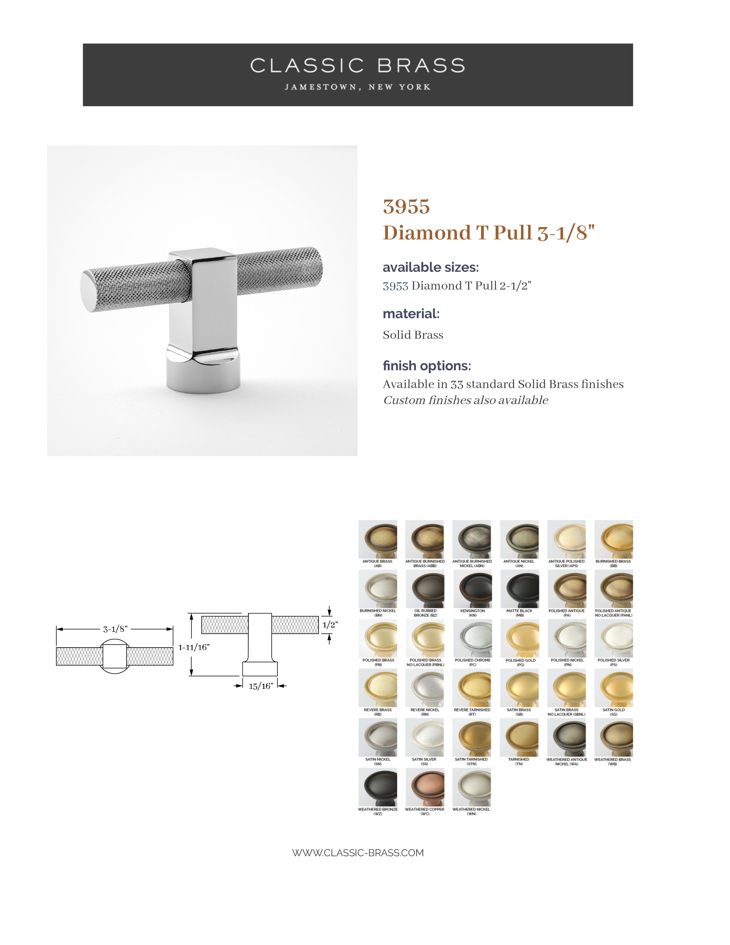 3955, T Pull - 3-1/8" Diamond, Classic Brass Apres Collection