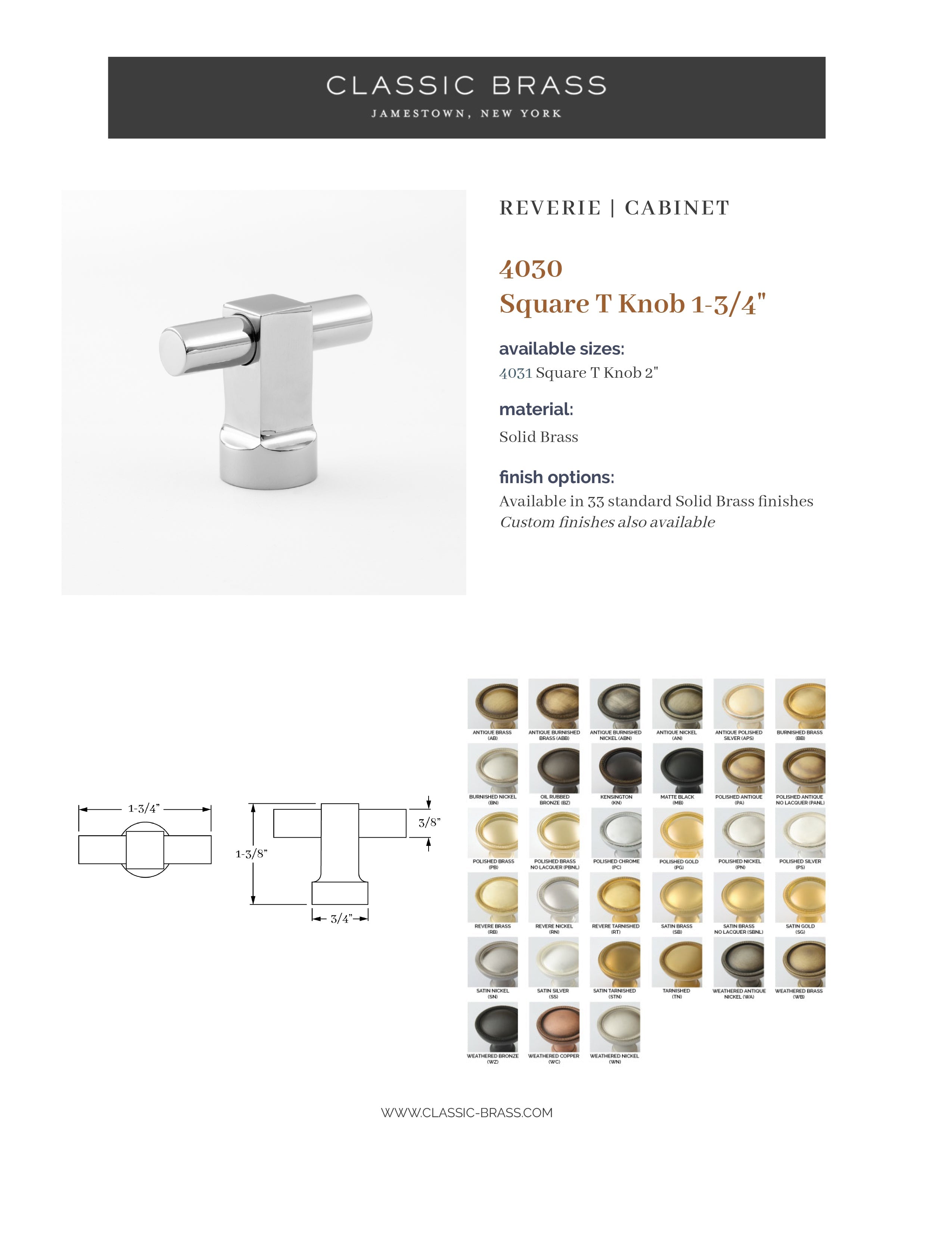 4030, T Knob - 1-3/4" Square, Classic Brass Reverie Collection
