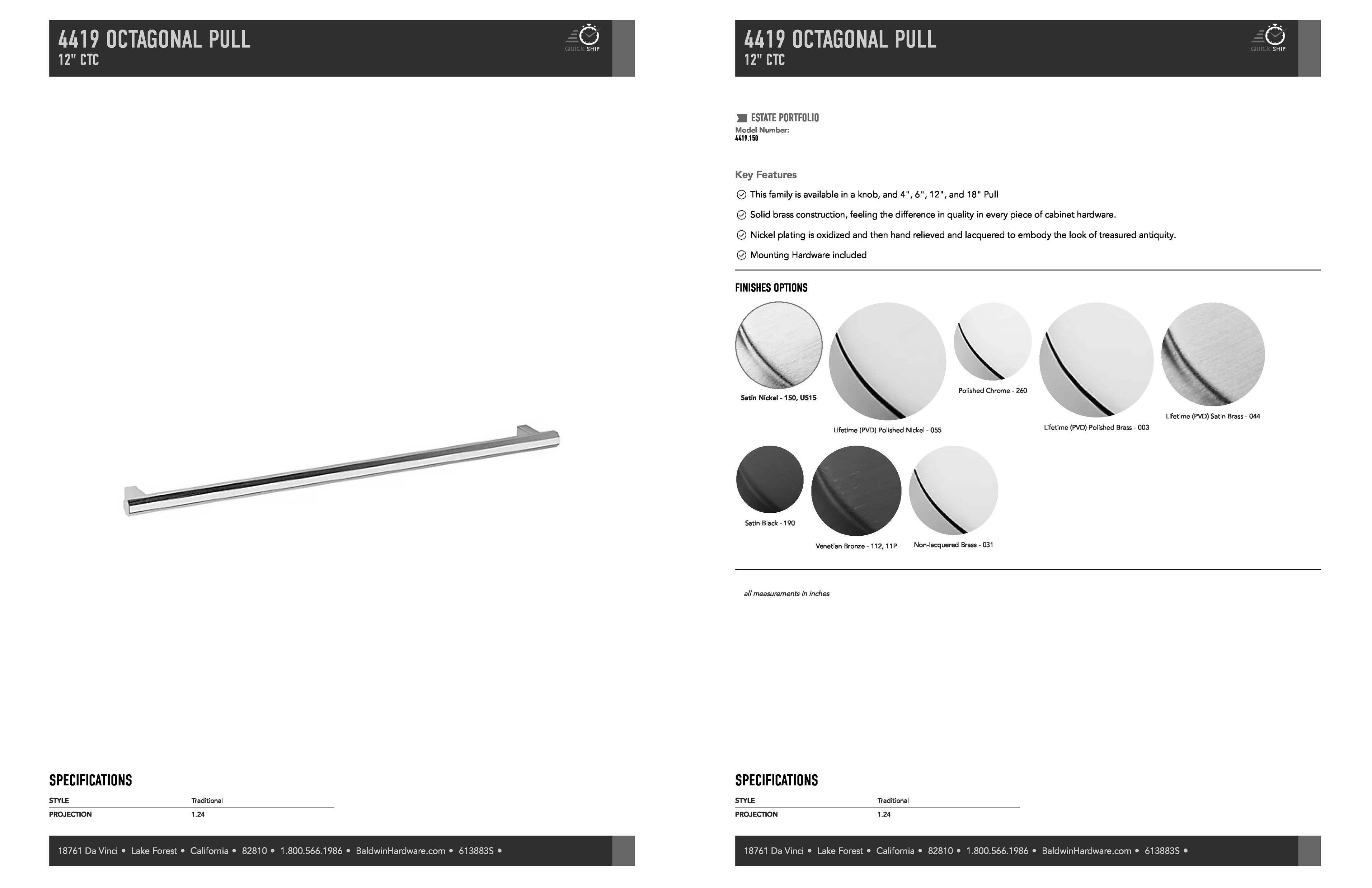 Octagonal Collection | Style: Traditional | Category: Cabinet | Sub Category: Pull | Material: Brass | Size: 12" CTC x 1.24" p. | Made in USA | Usually Ships 2-3 Weeks