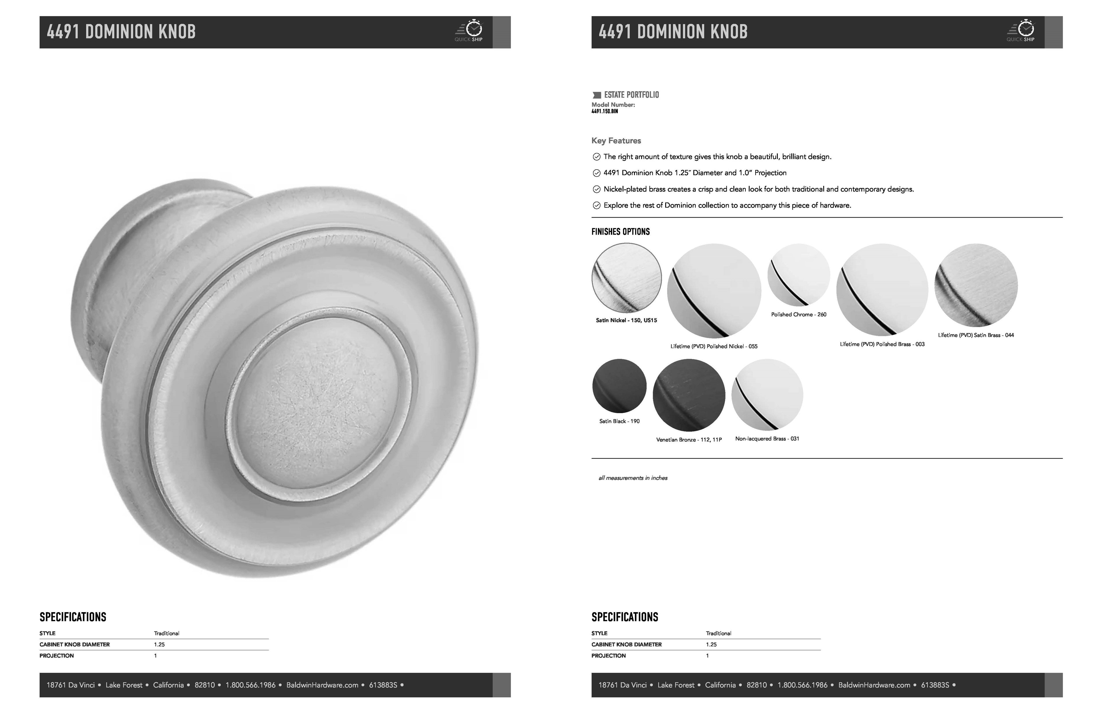 4491, Dominion Knob - 1.25" d. x 1.0" p., BH Dominion Collection