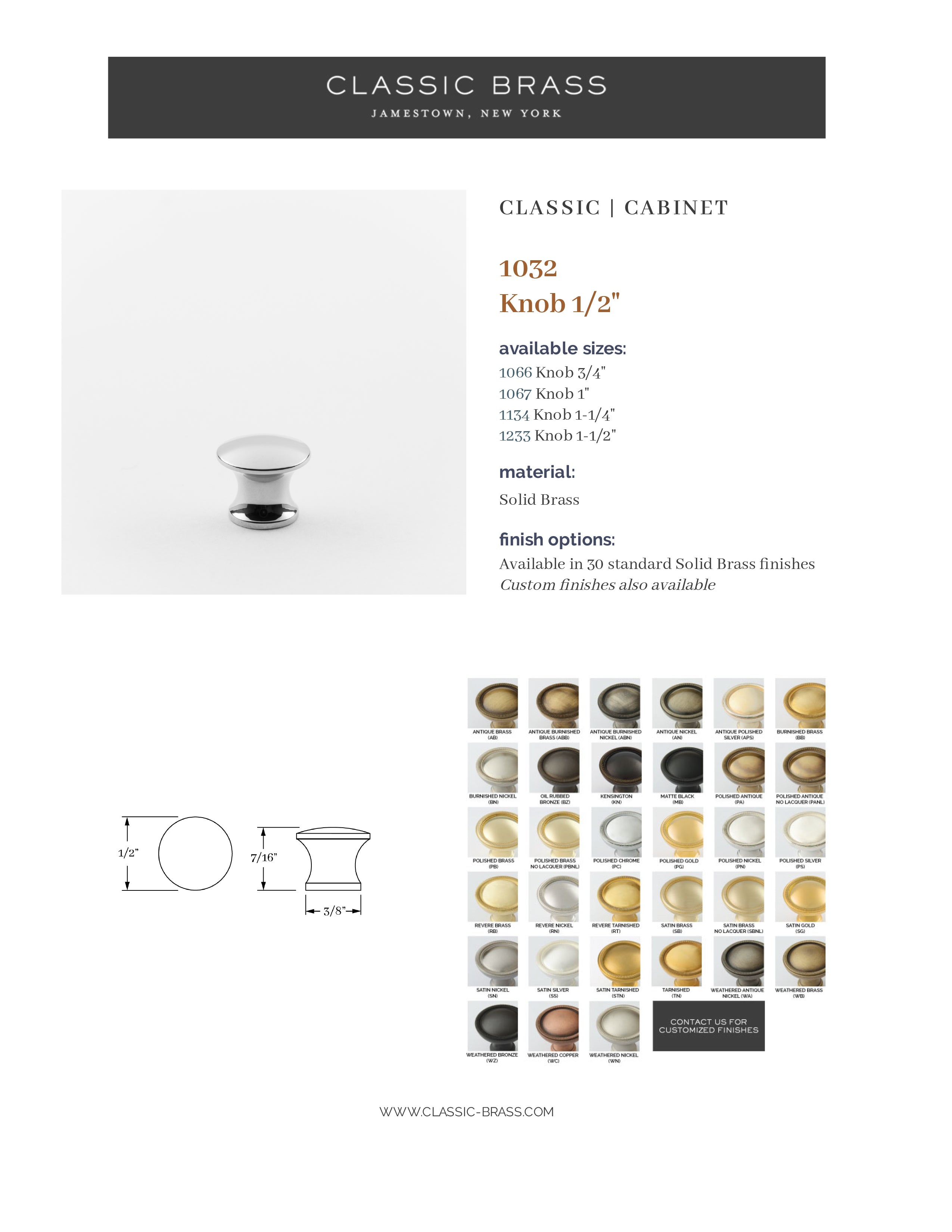 1032, Knob - 1/2", Classic Brass Hutter Collection