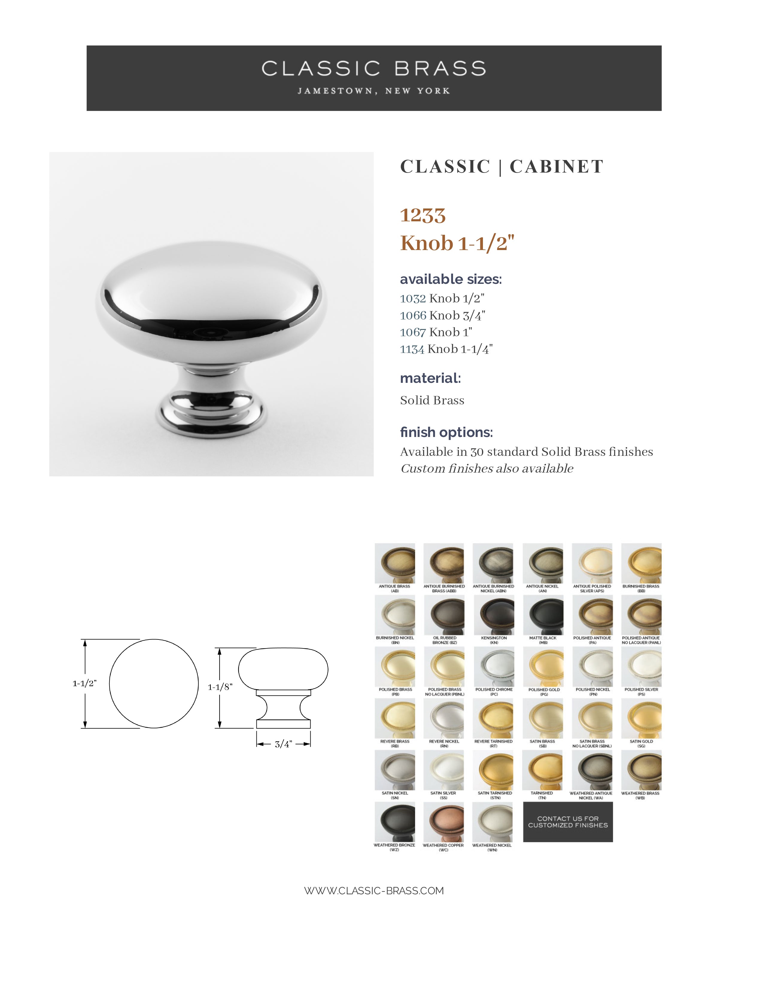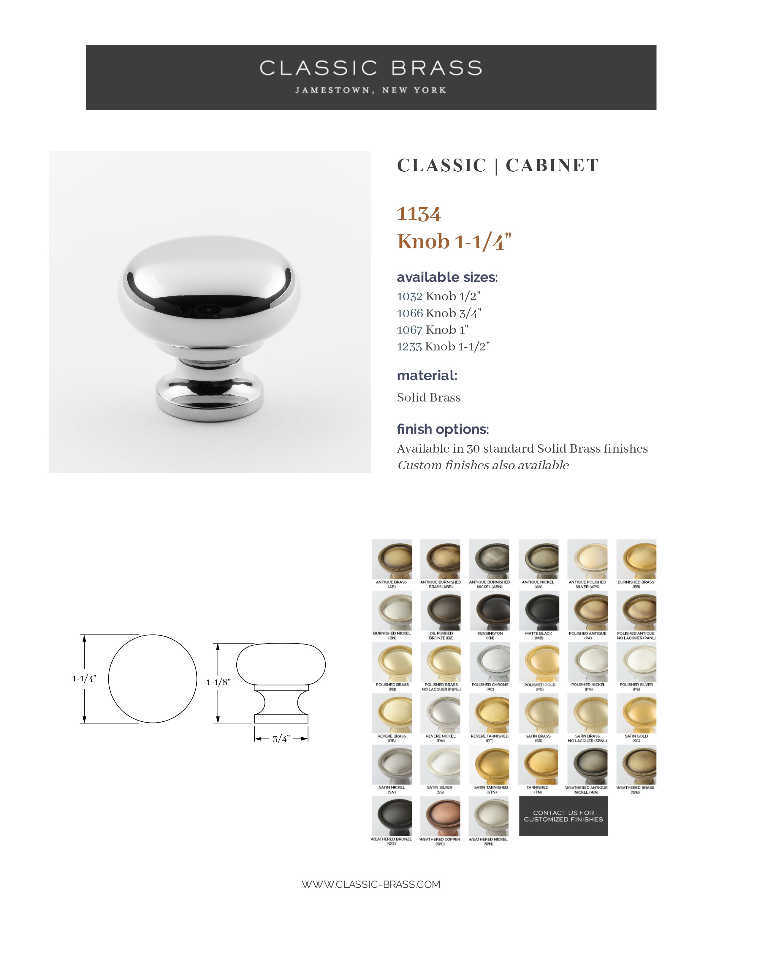 1134, Knob - 1-1/4", Classic Brass Hutter Collection