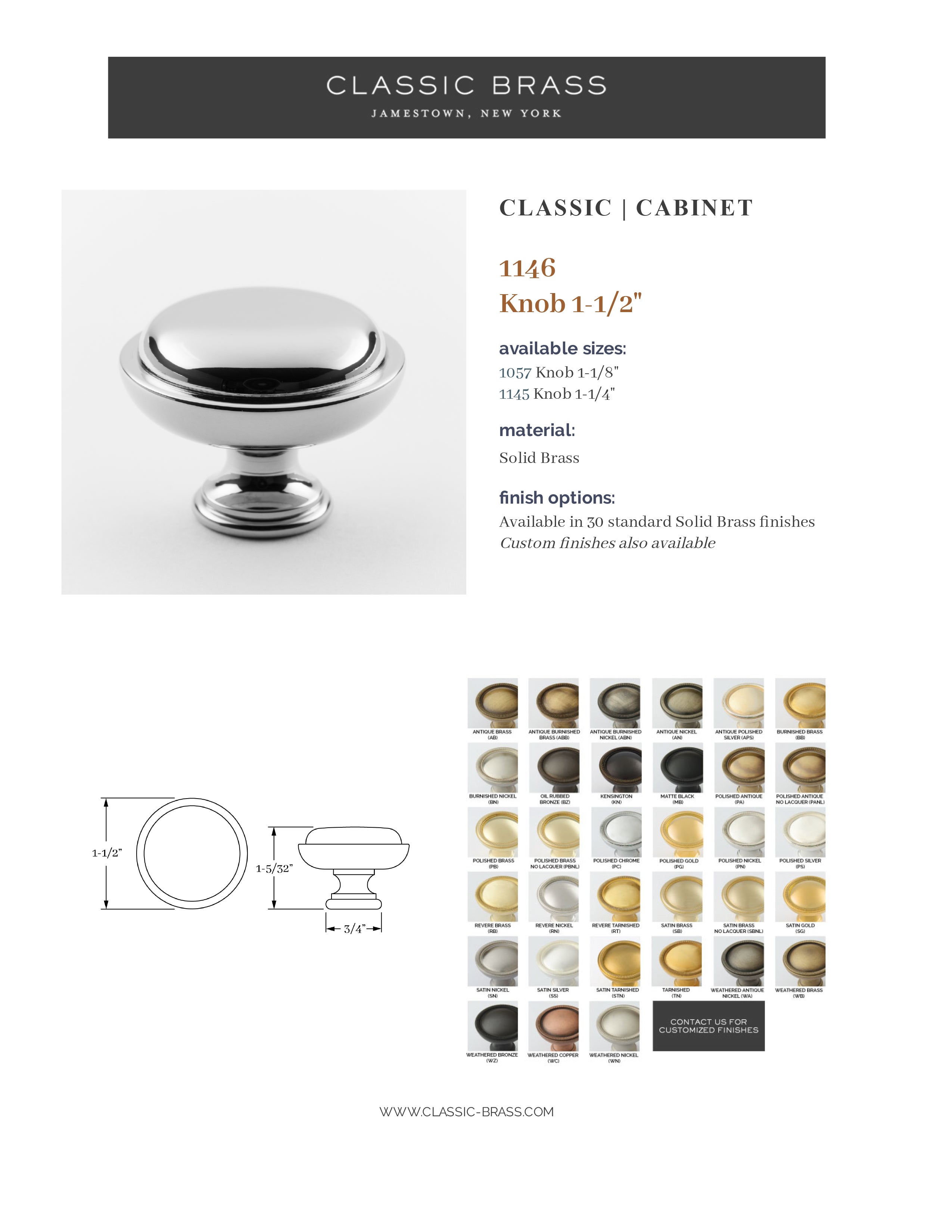 1146, Knob - 1-1/2", Classic Brass Hutter Collection