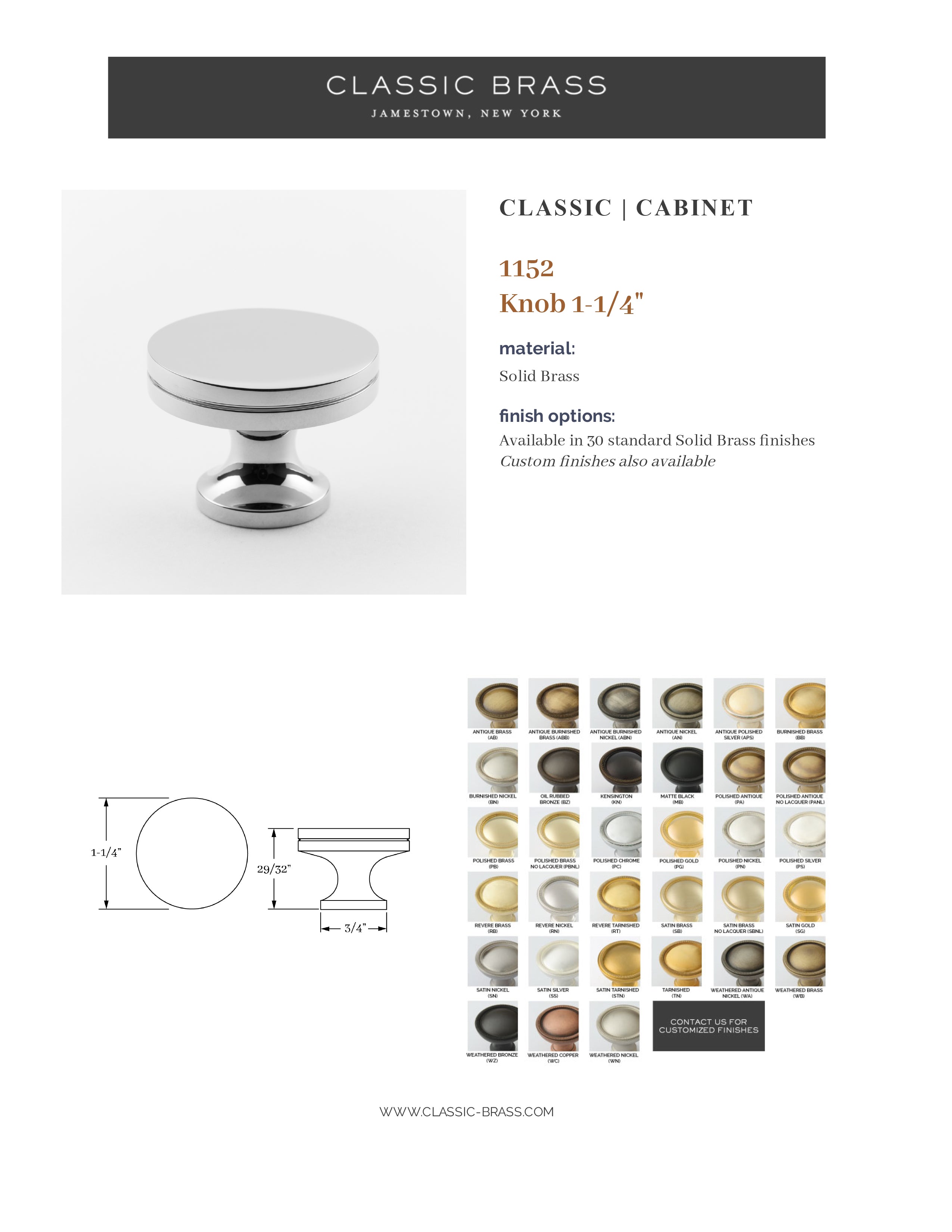 1152, Knob - 1-1/4", Classic Brass Hutter Collection