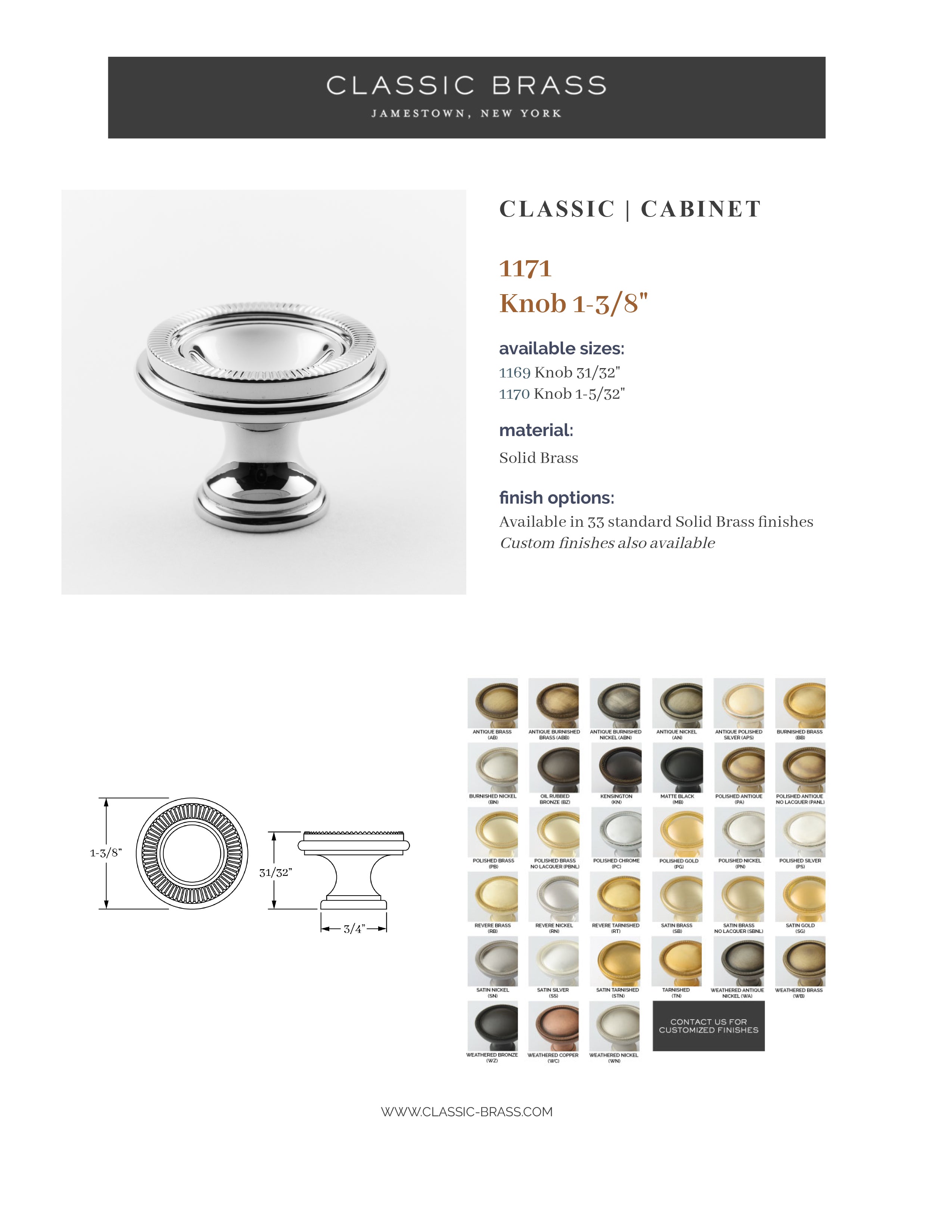 1170, Knob - 1-5/32", Classic Brass Hutter Collection