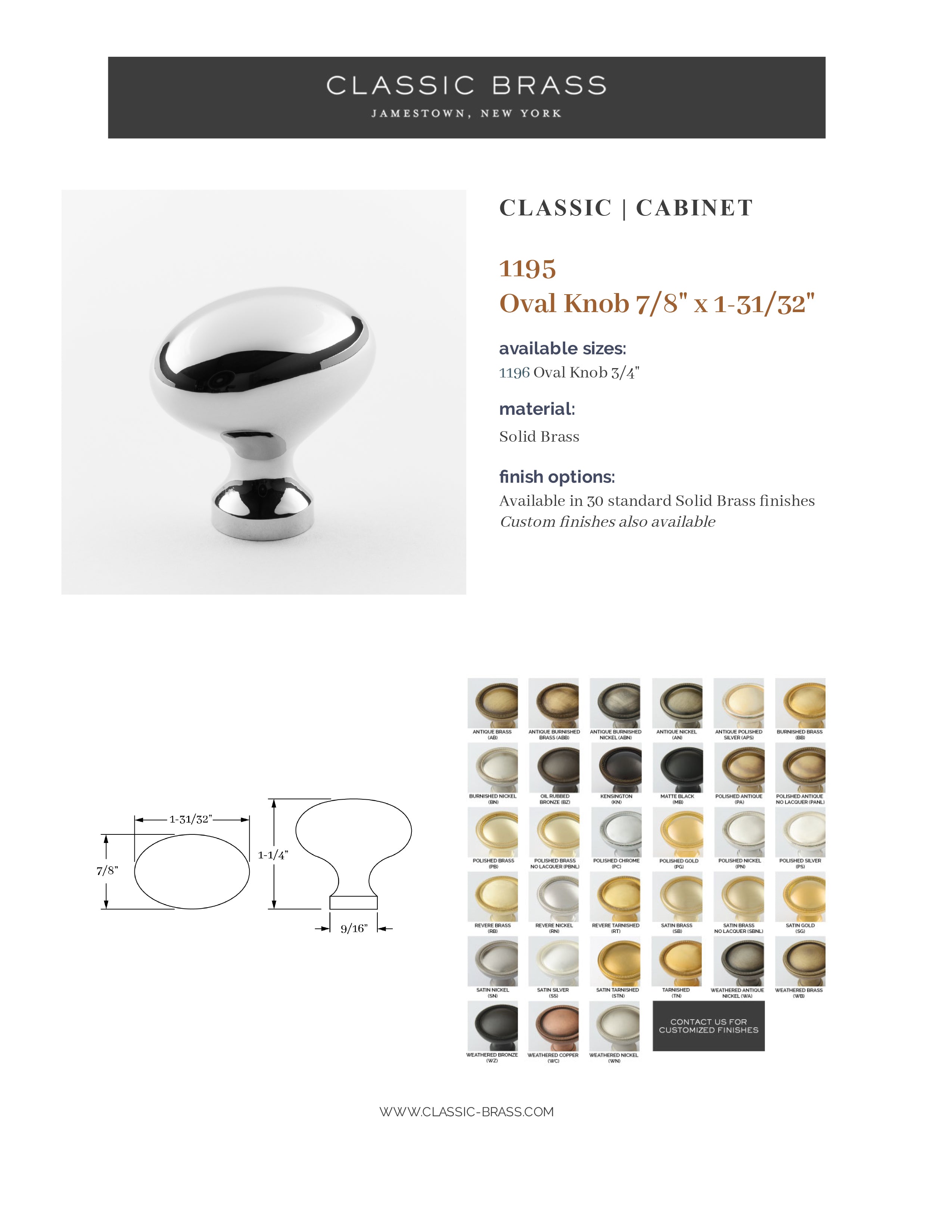 1196, Oval Knob - 1-7/32" x 3/4", Classic Brass Hutter Collection