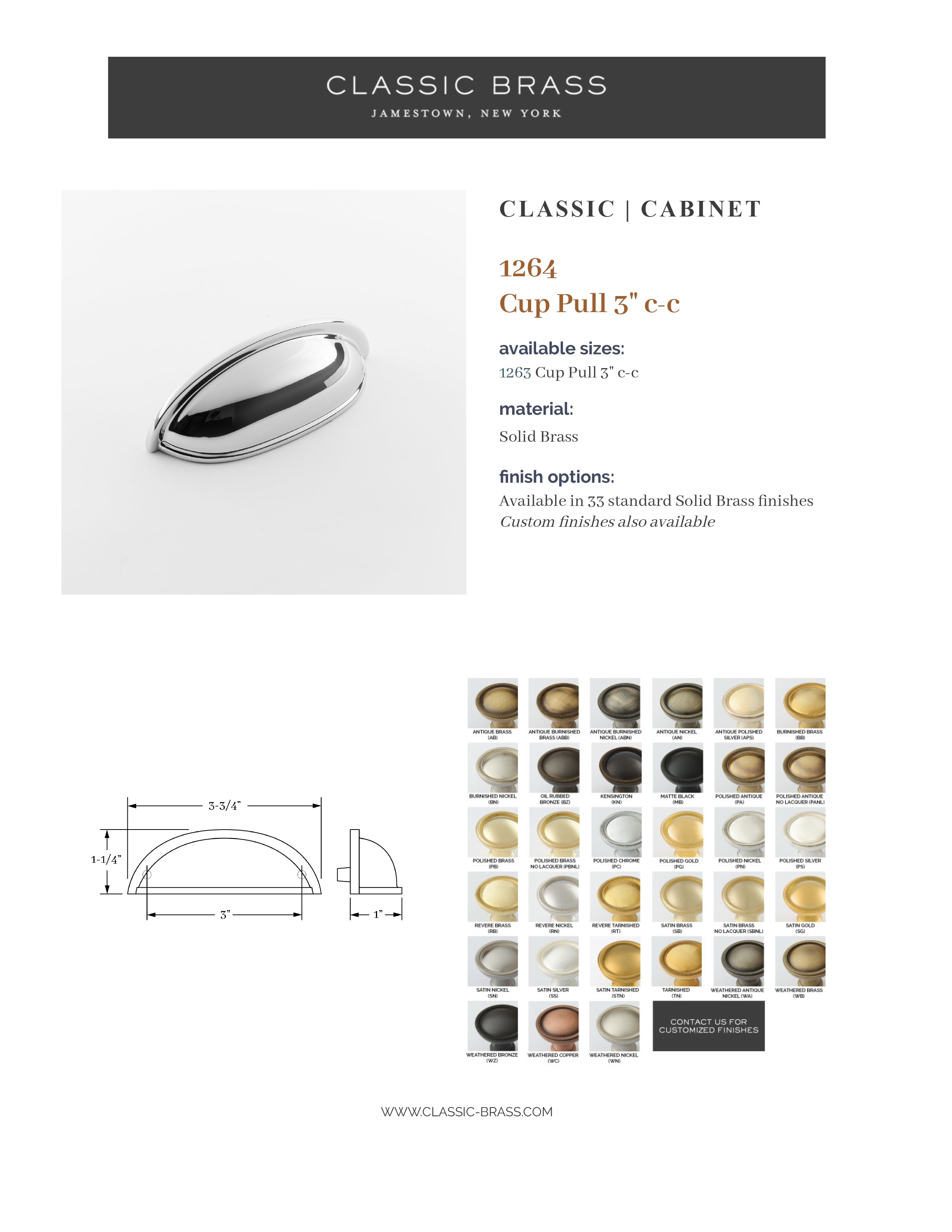1264, Cup Pull - 3" c-c, Classic Brass Hutter Collection