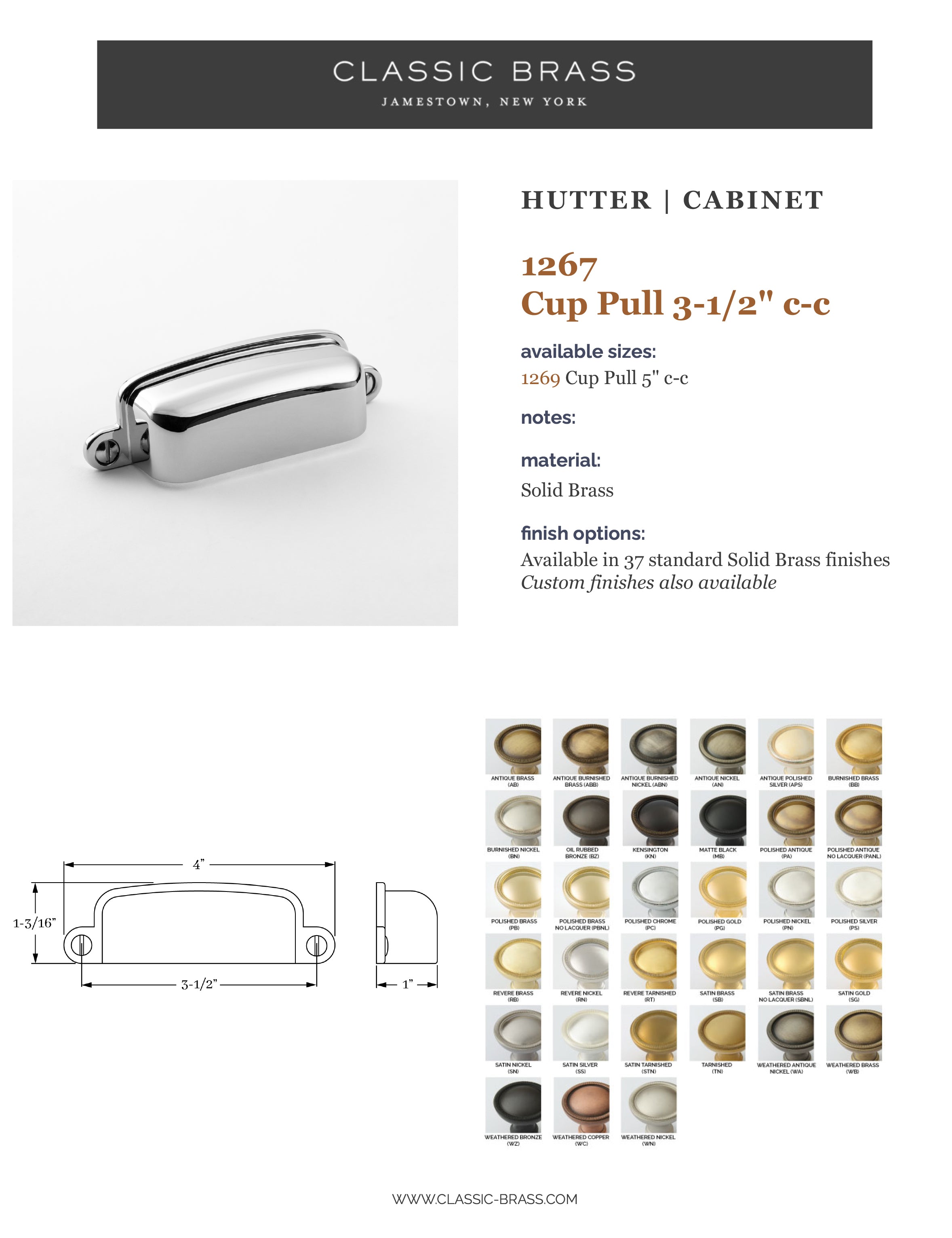 1267, Cup Pull - 3-1/2" c-c w/exposed screws, Classic Brass Hutter Collection