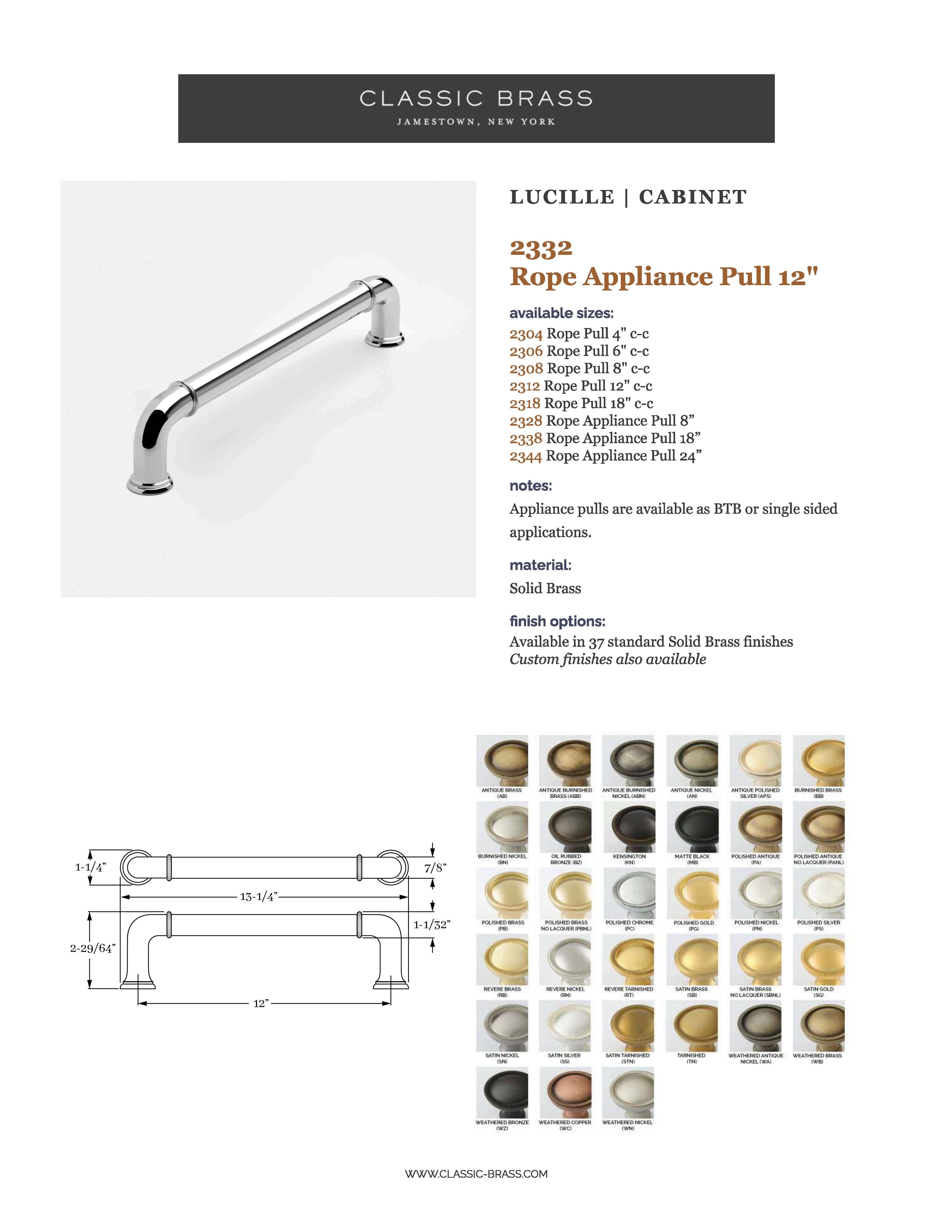 2332, Appliance Pull - Rope - 12" c-c, Classic Brass Lucille Collection