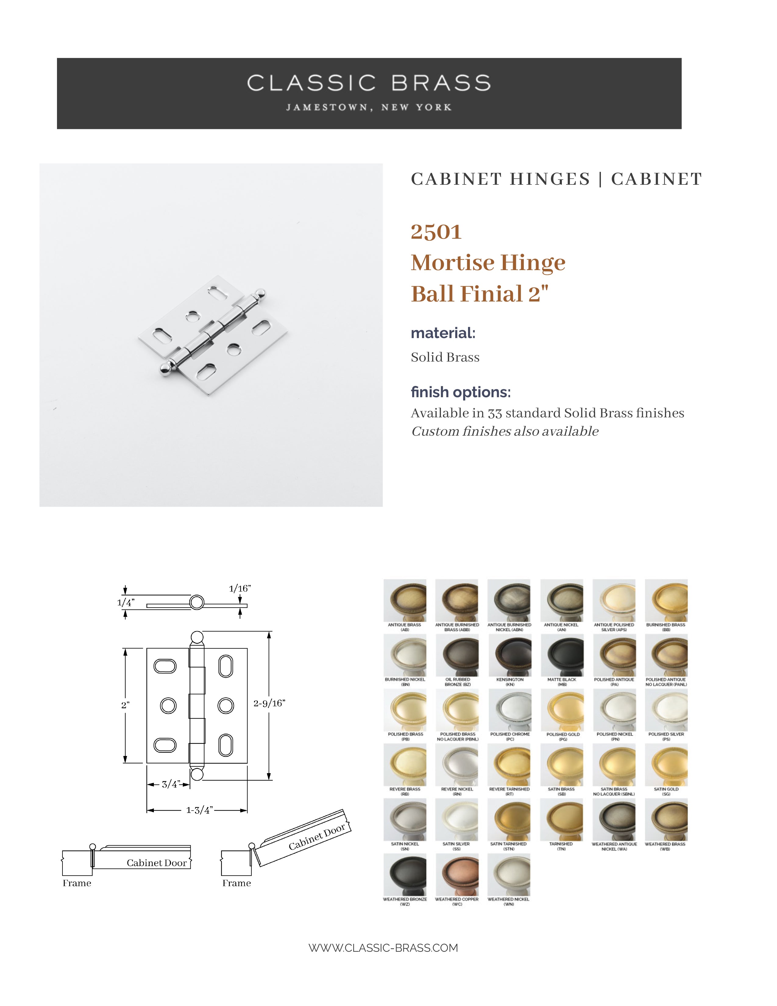 2501, Hinge - Mortise - Ball Finial, Classic Brass Hinges