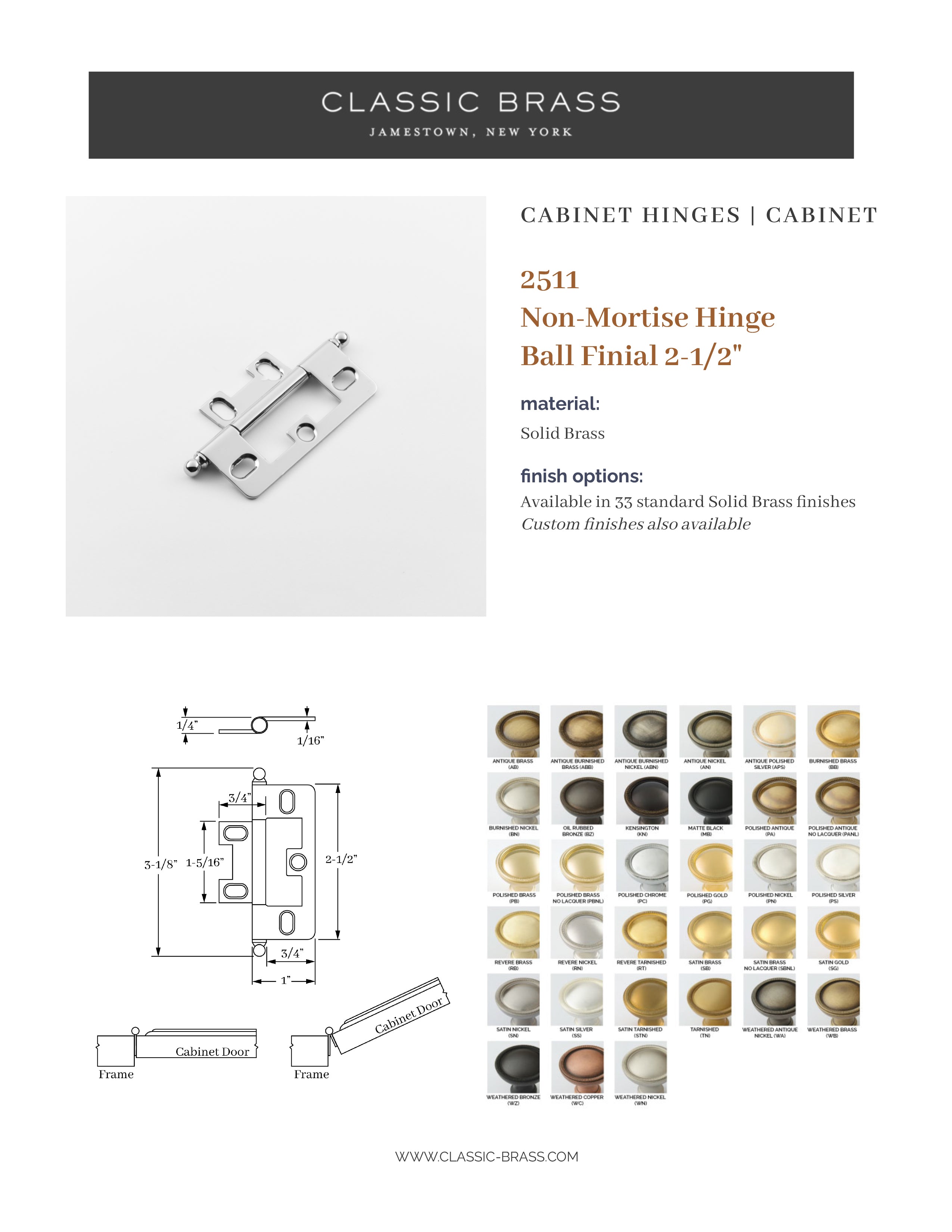 2511, Hinge - Non-Mortise - Ball Finial, Classic Brass Hinges