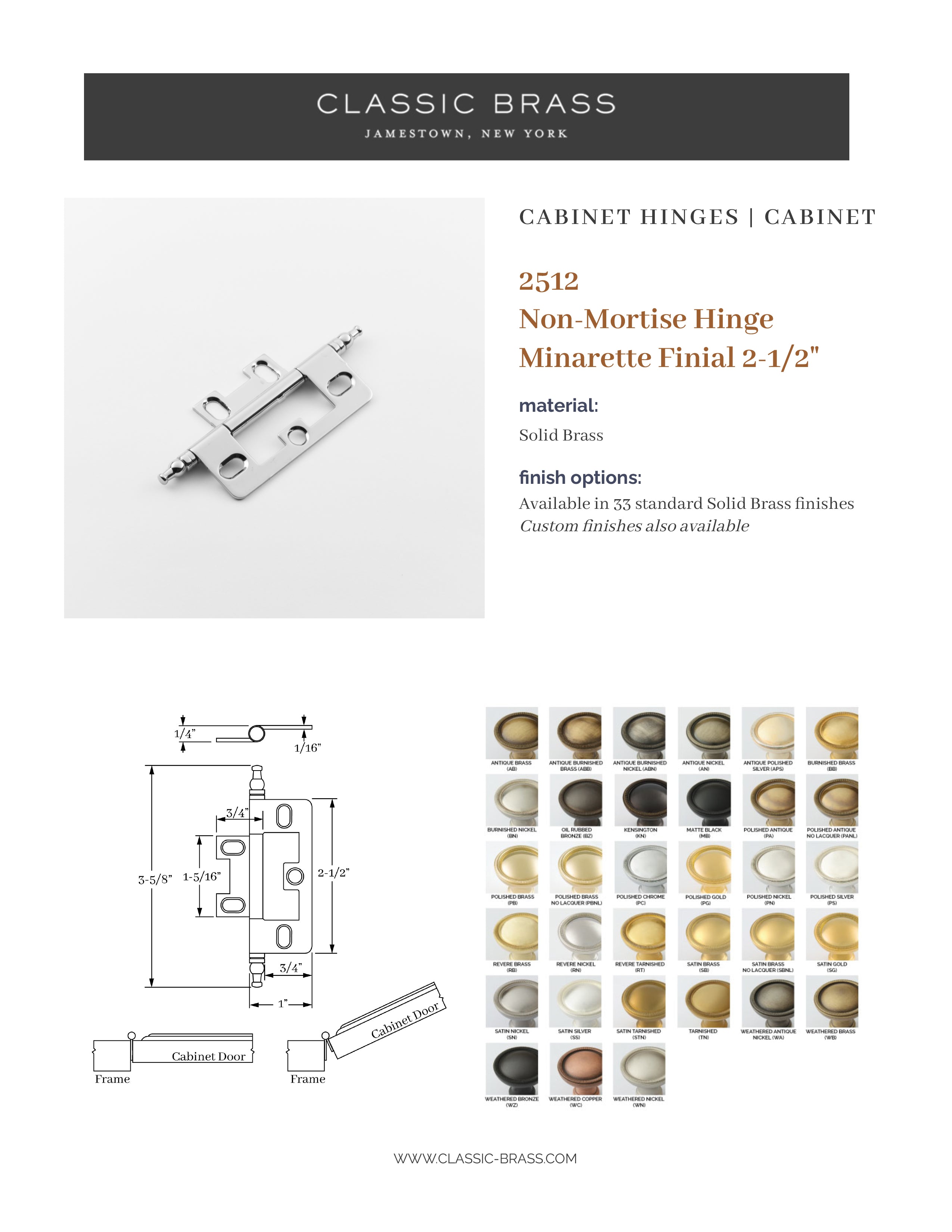 2512, Hinge - Non-Mortise - Minarette Finial, Classic Brass Hinges