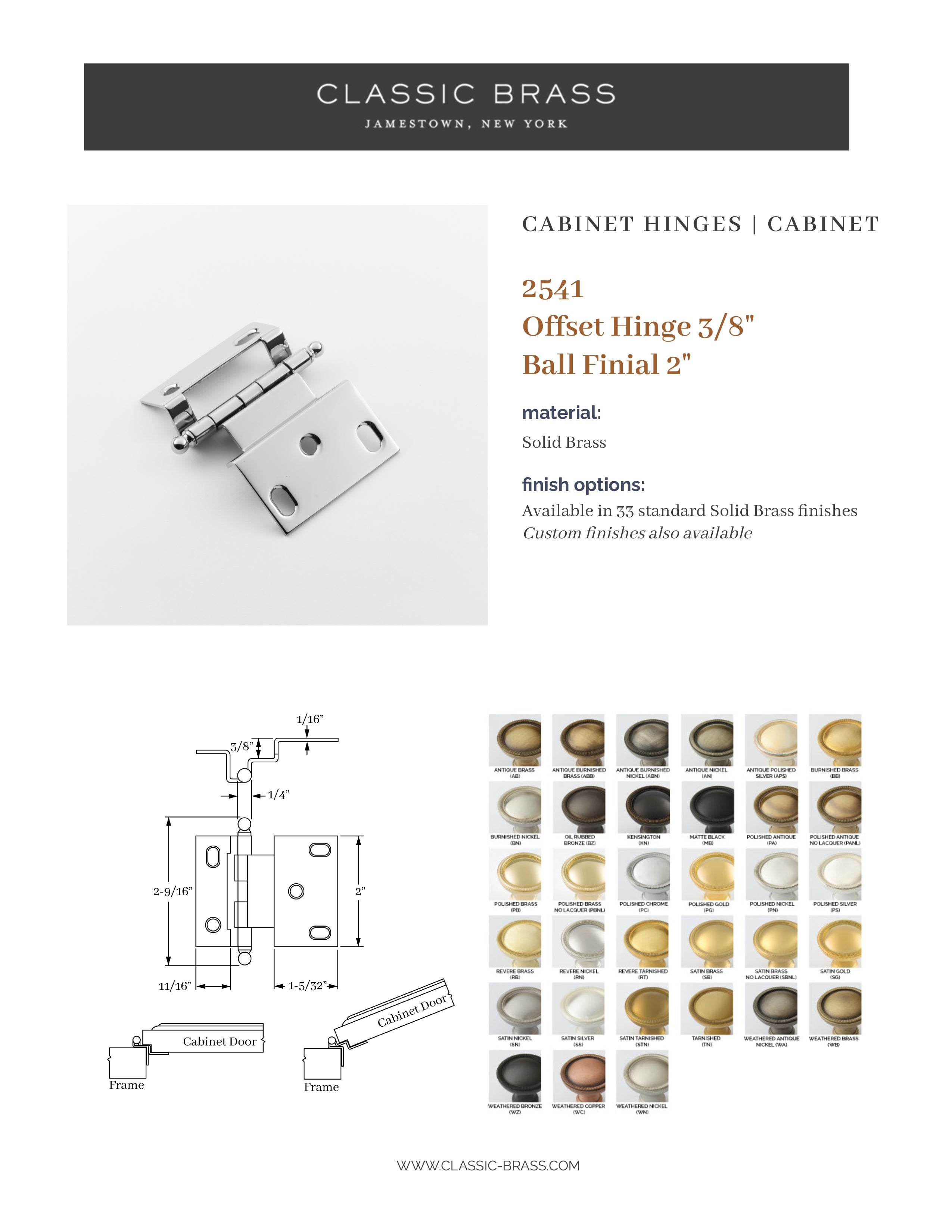2541, Hinge - 3/8" Offset - Ball Finial, Classic Brass Hinges