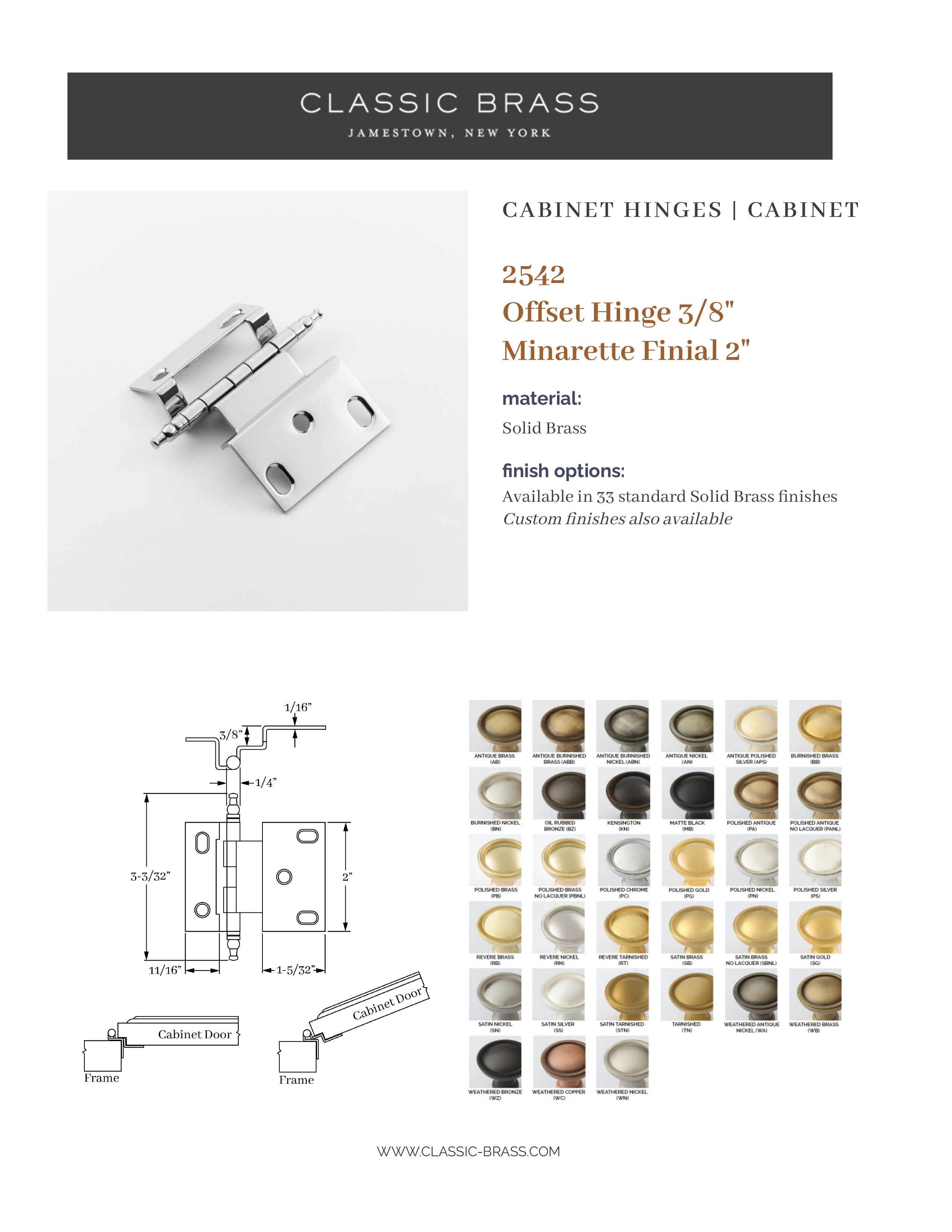 2542, Hinge - 3/8" Offset - Minarette Finial, Classic Brass Hinges