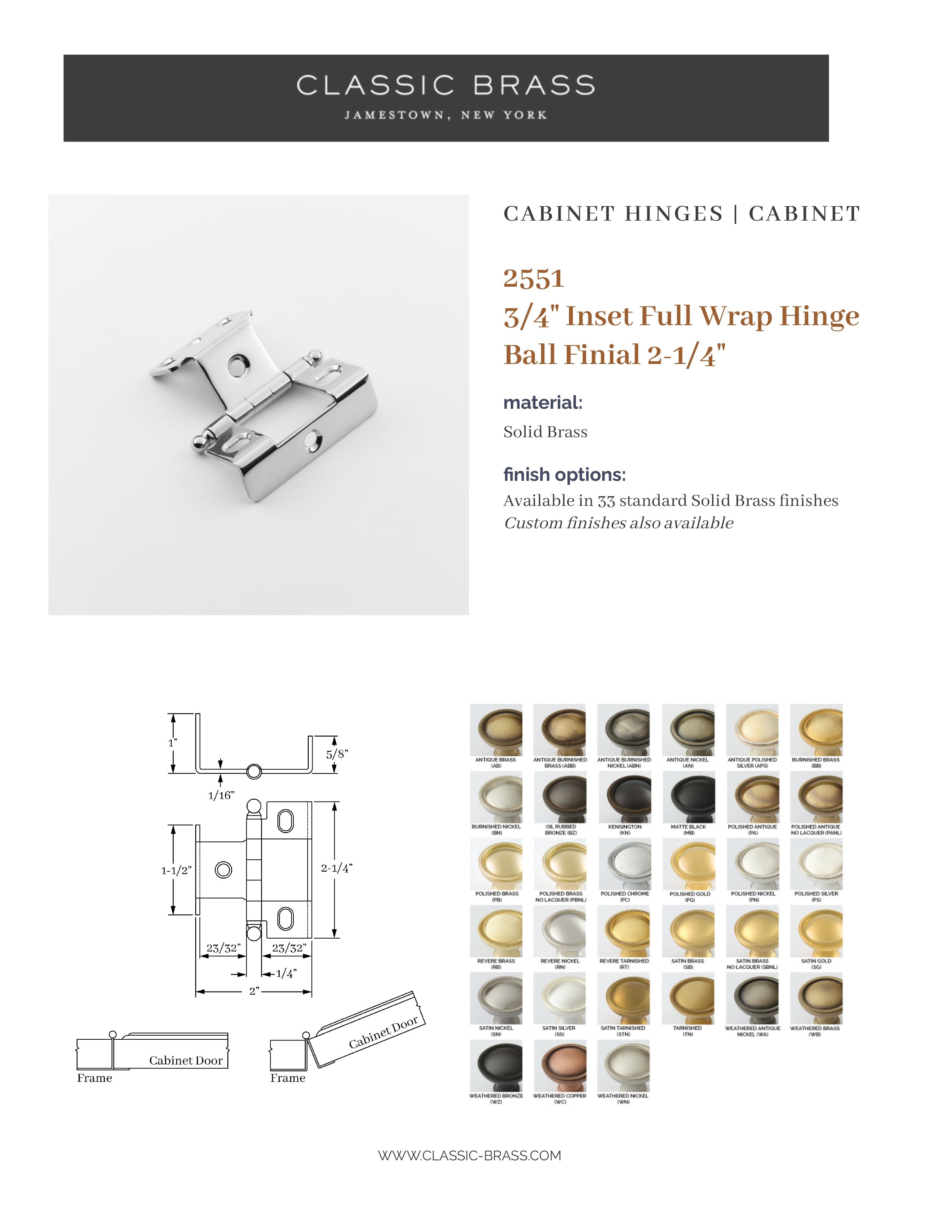 2551, Hinge - 3/4" Full Wrap - Ball Finial, Classic Brass Hinges