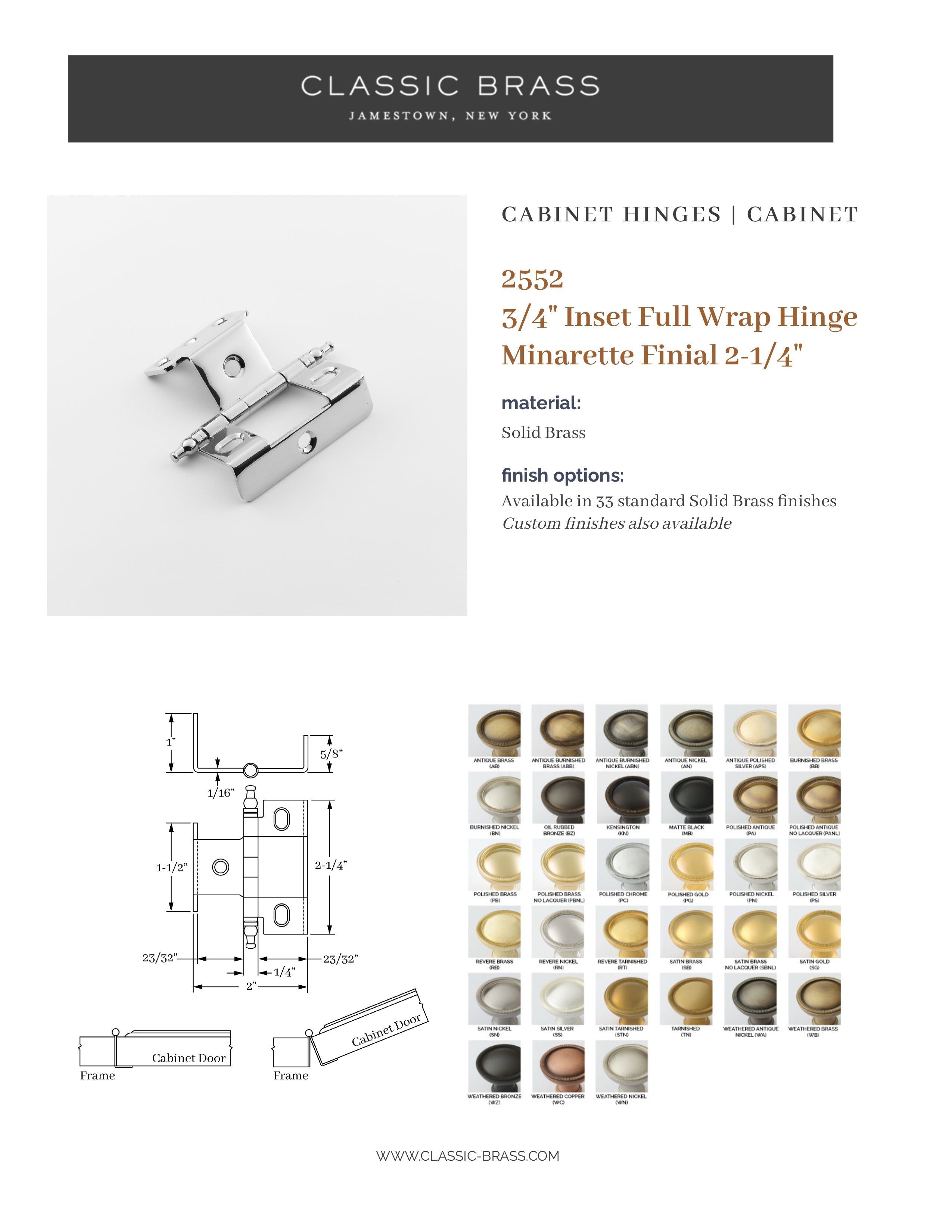 2552, Hinge - 3/4" Full Wrap - Minarette Finial, Classic Brass Hinges