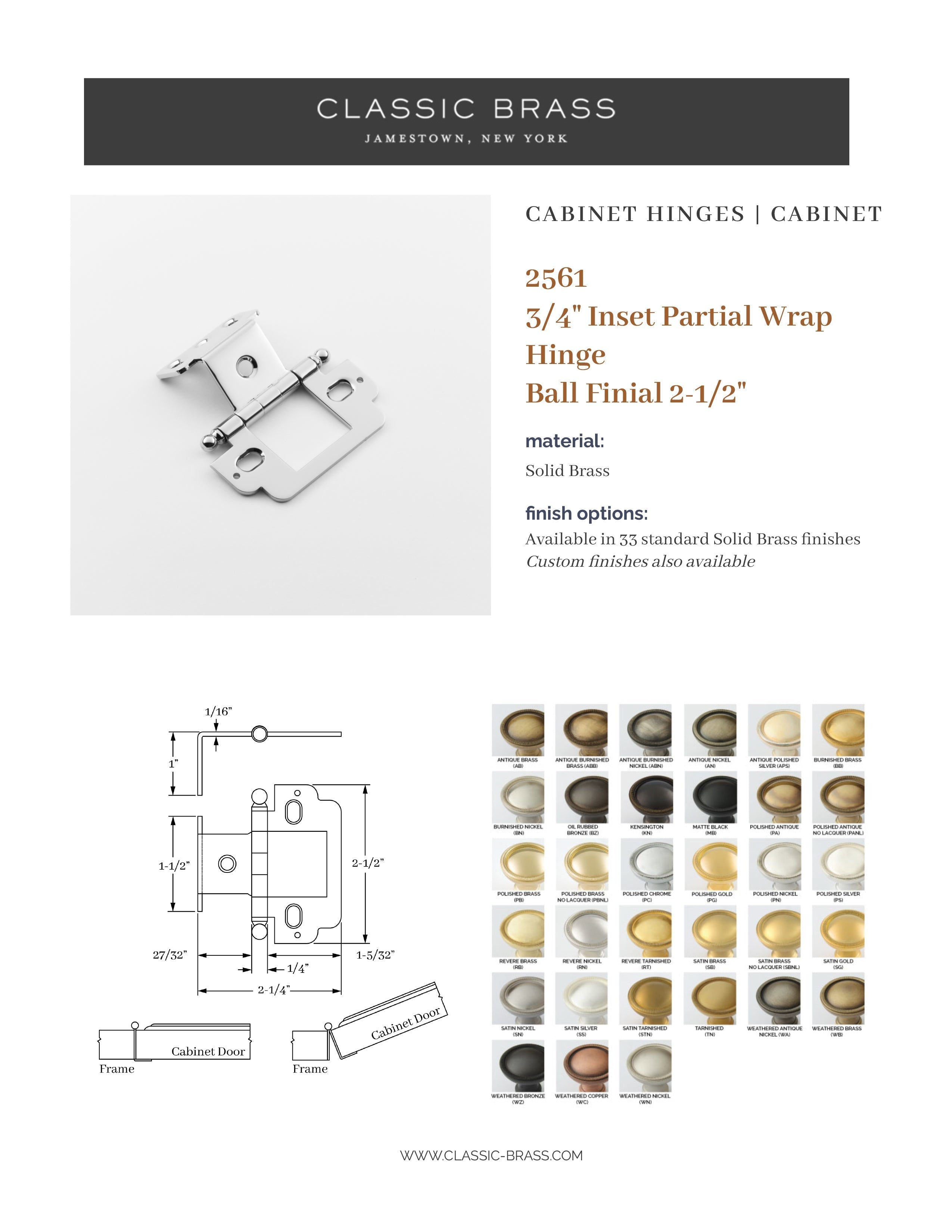 2561, Hinge - 3/4" Partial Wrap - Ball Finial, Classic Brass Hinges