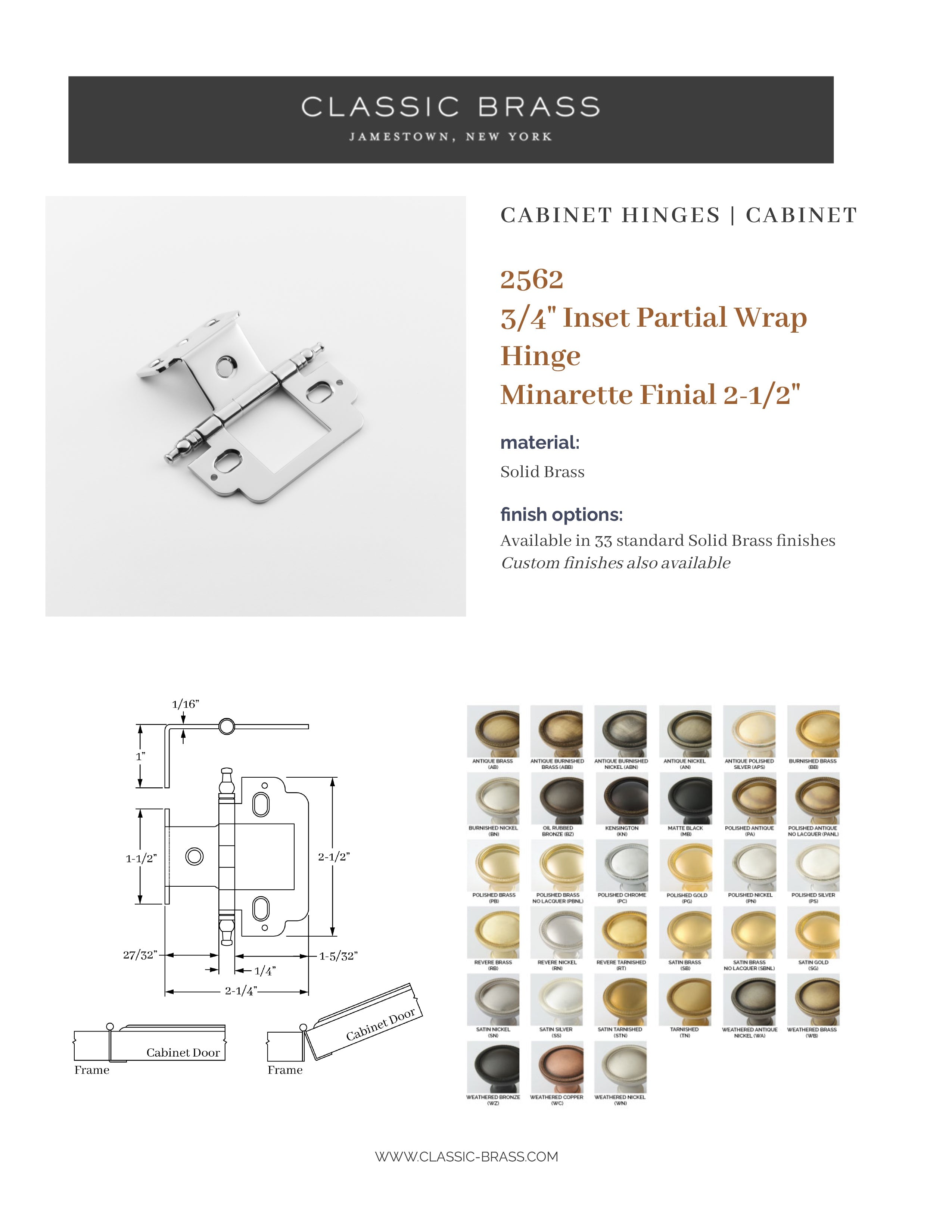 2562, Hinge - 3/4" Partial Wrap - Minarette Finial, Classic Brass Hinges