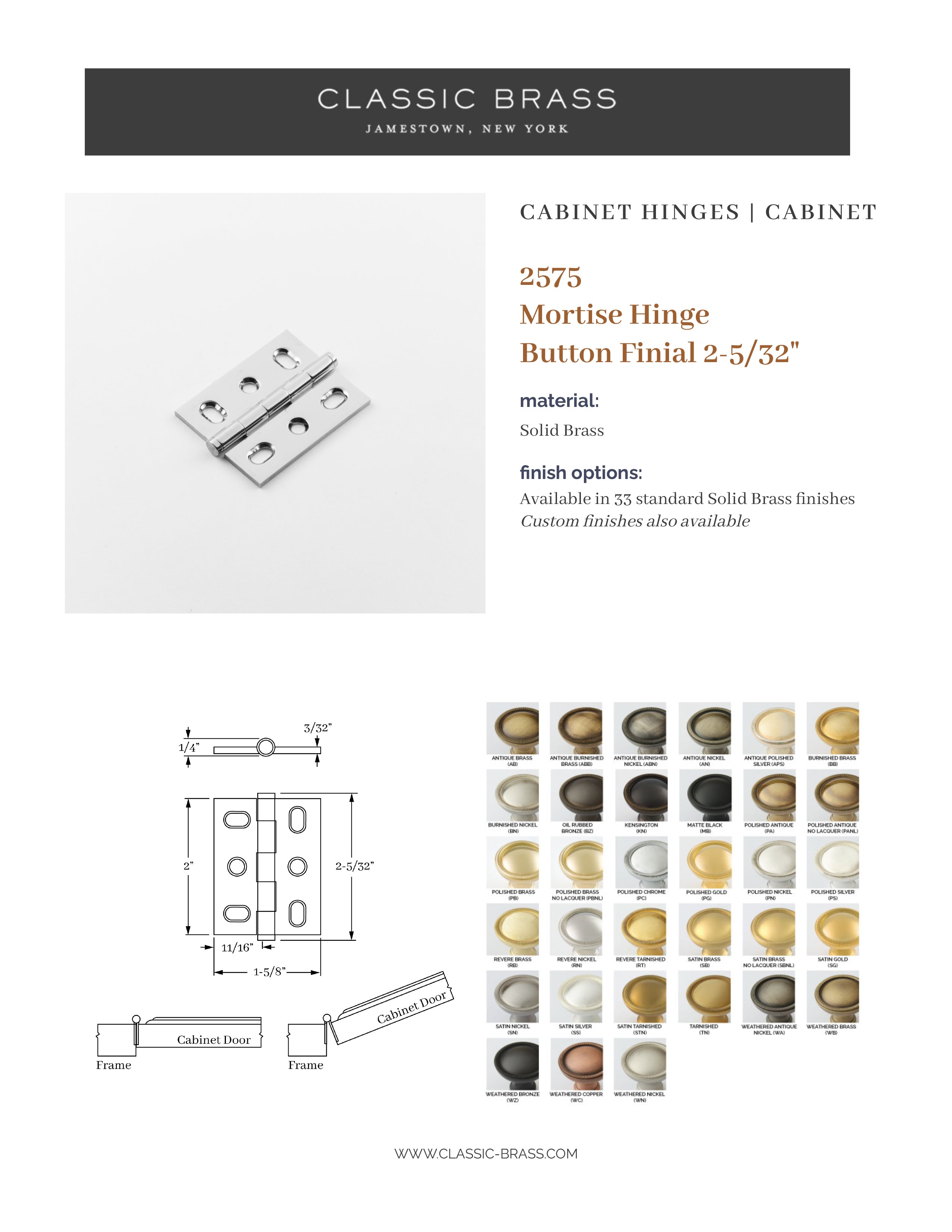 2575, Hinge - Mortise - Button Finial, Classic Brass Hinges