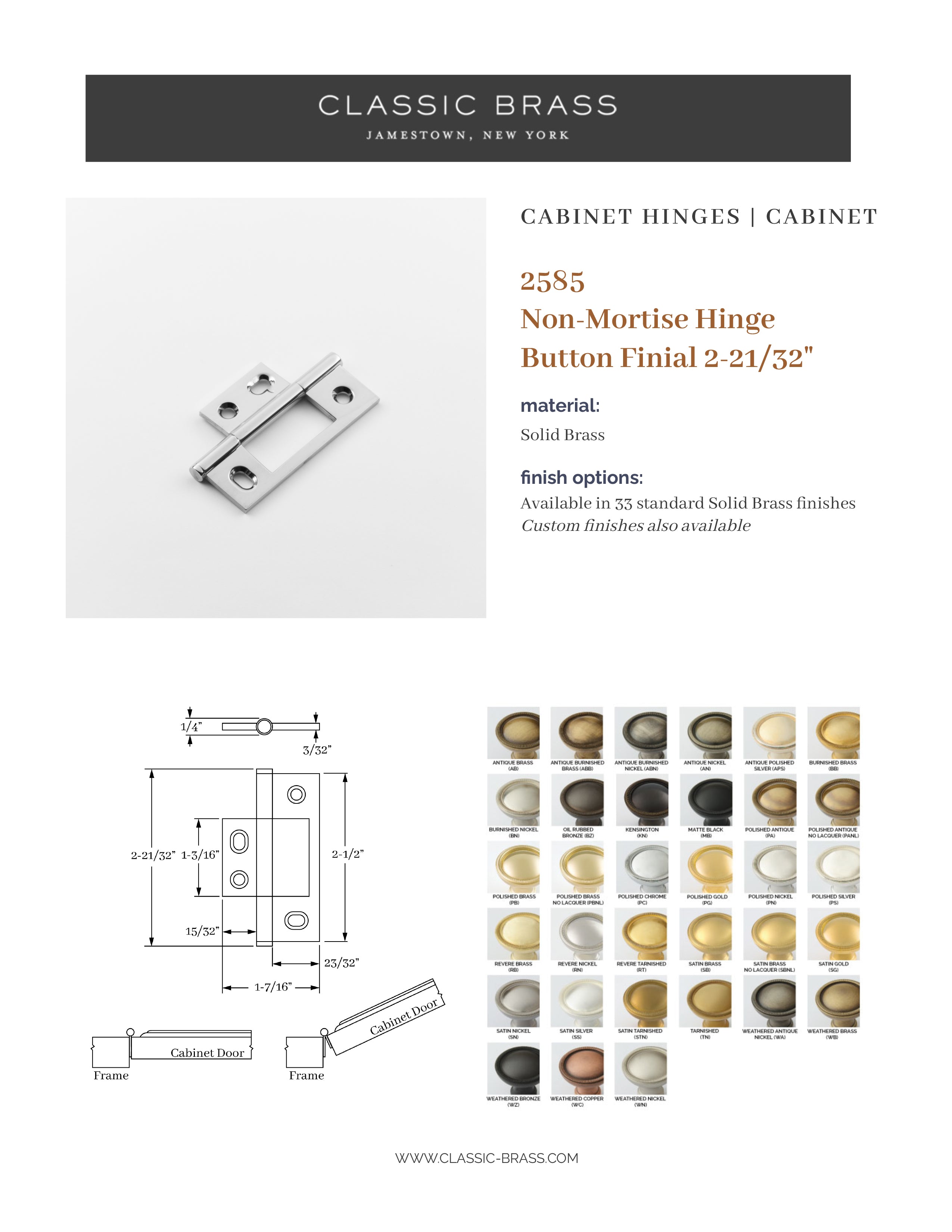 2585, Hinge - Non-Mortise - Button Finial, Classic Brass Hinges
