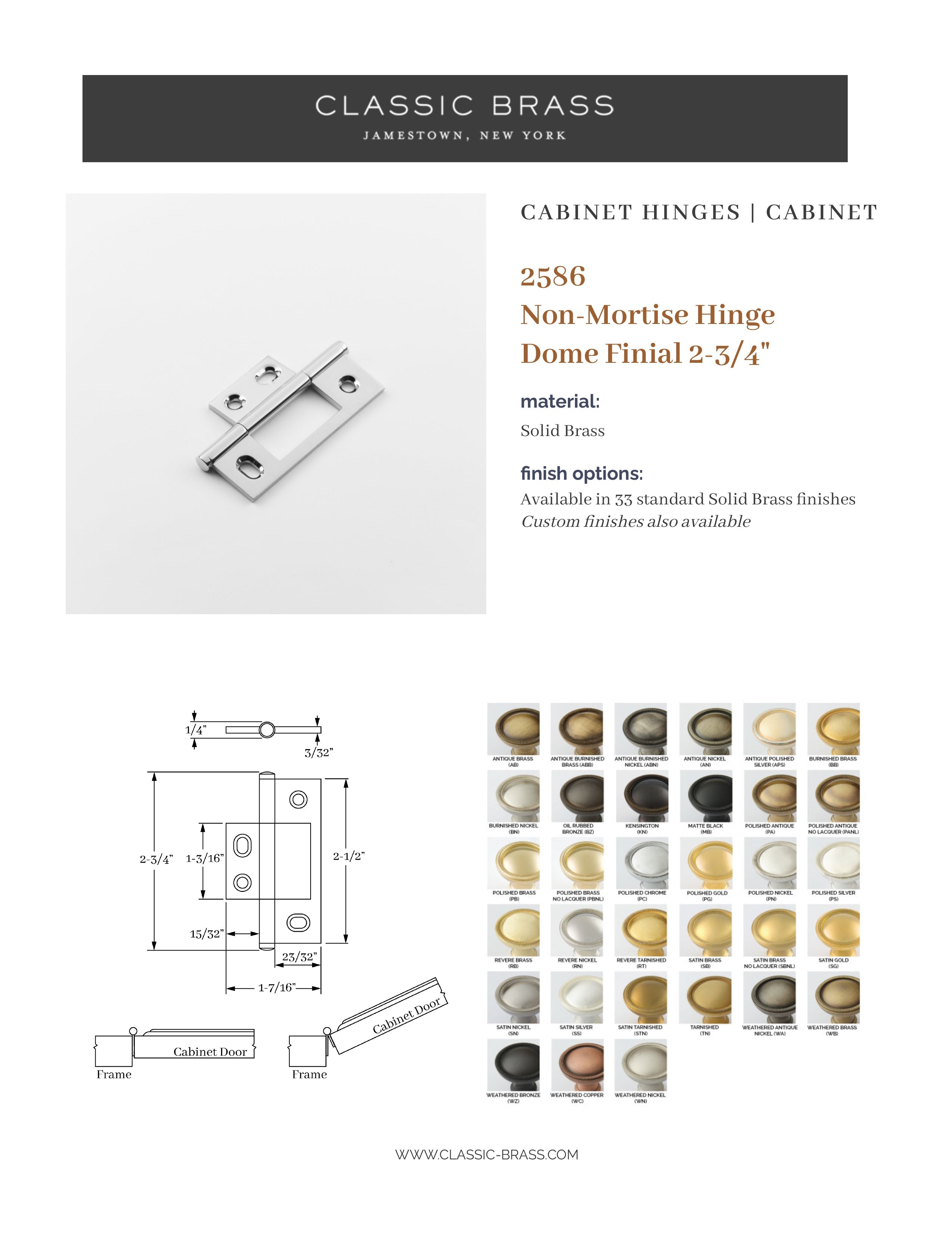 2586, Hinge - Non-Mortise - Dome Finial, Classic Brass Hinges