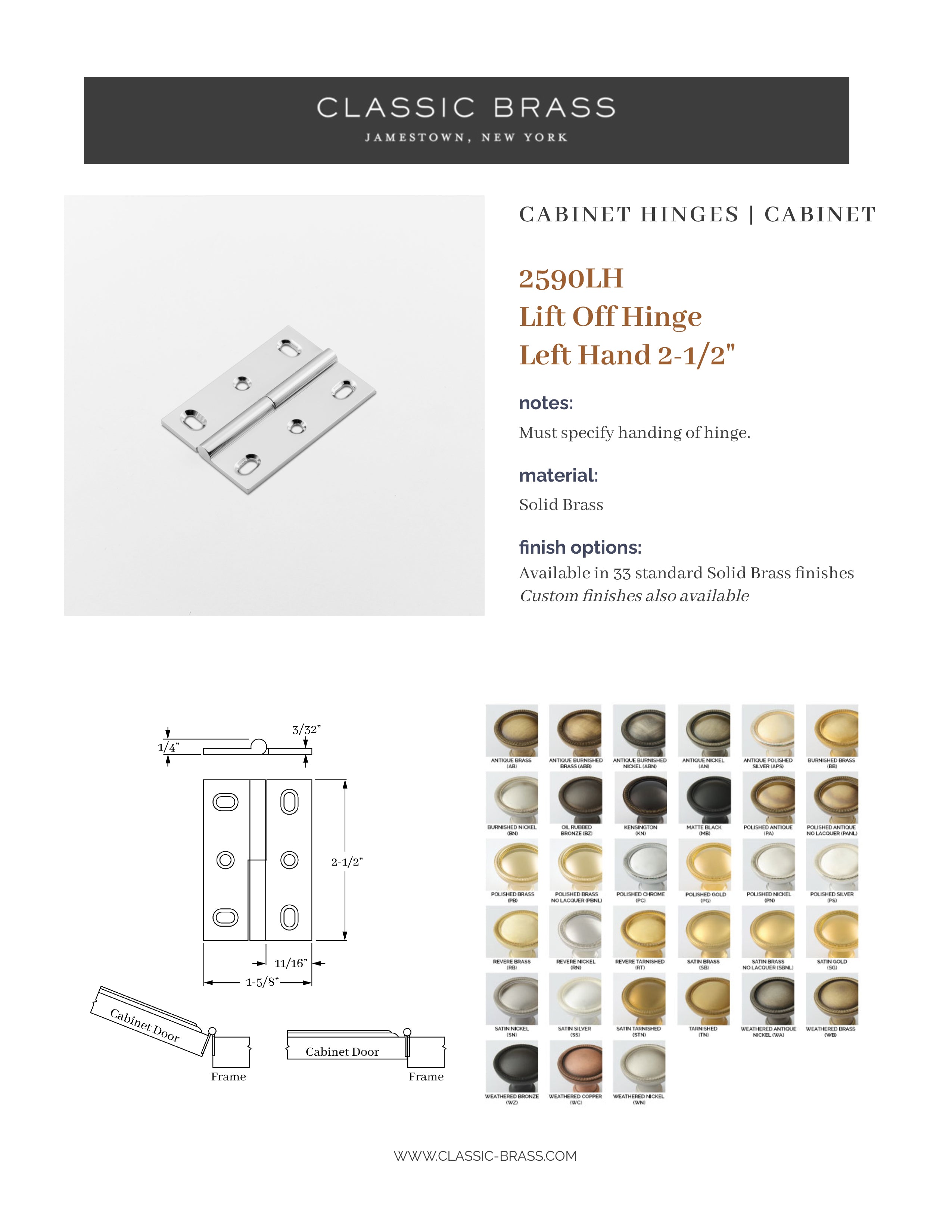2590LH, LH Lift Off Hinge - 2.5", Classic Brass Hinges