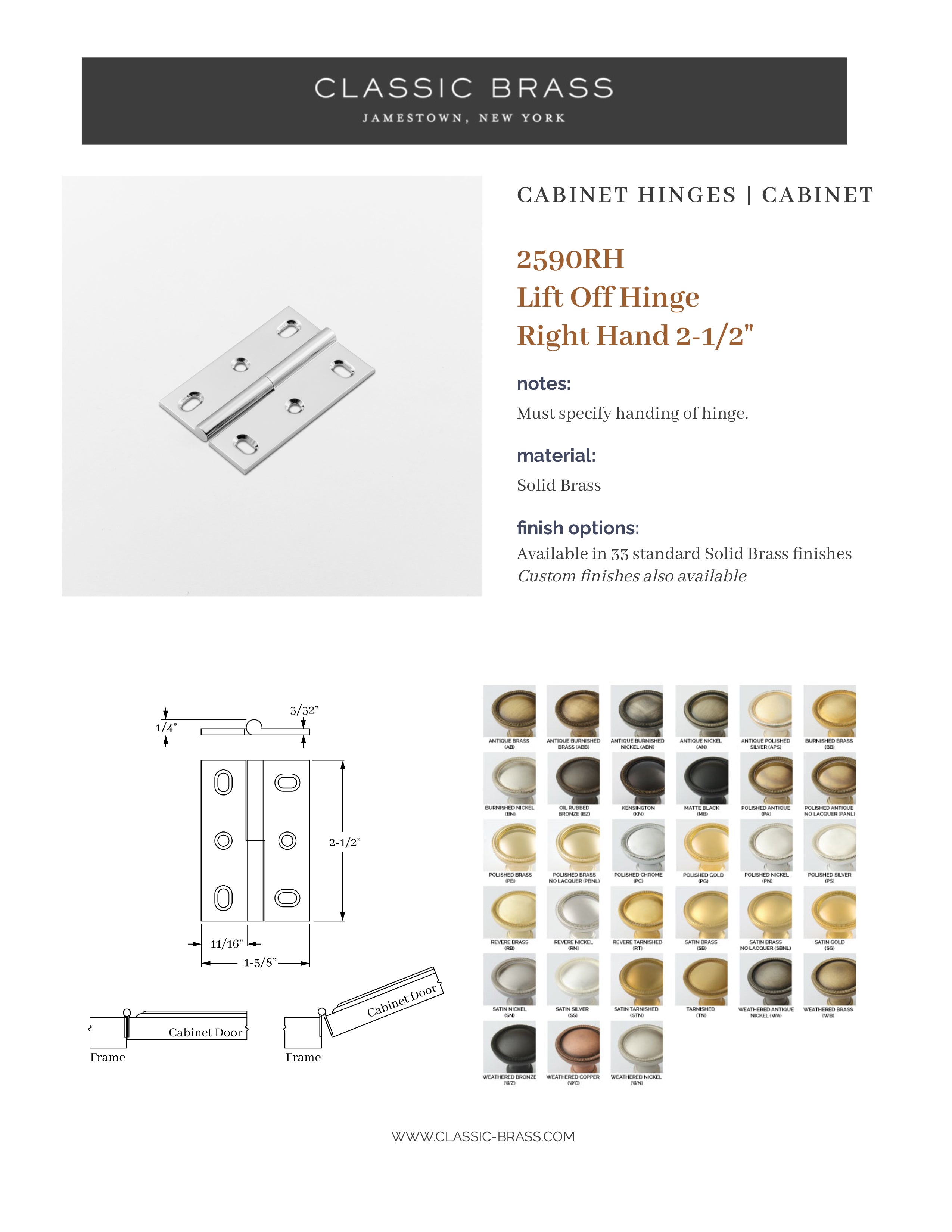 2590RH, RH Lift Off Hinge - 2.5", Classic Brass Hinges