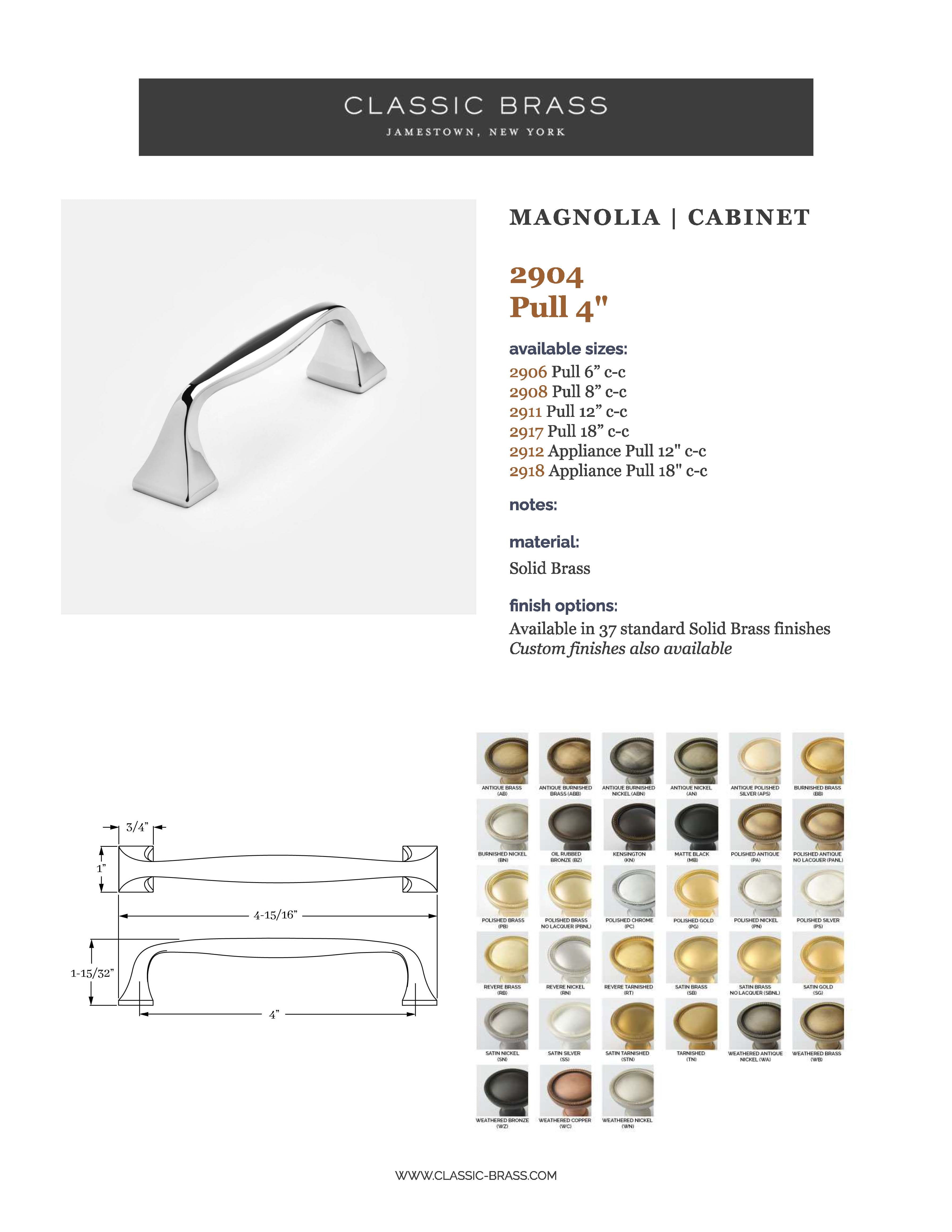 2904, Pull - 4" c-c, Classic Brass Magnolia Collection