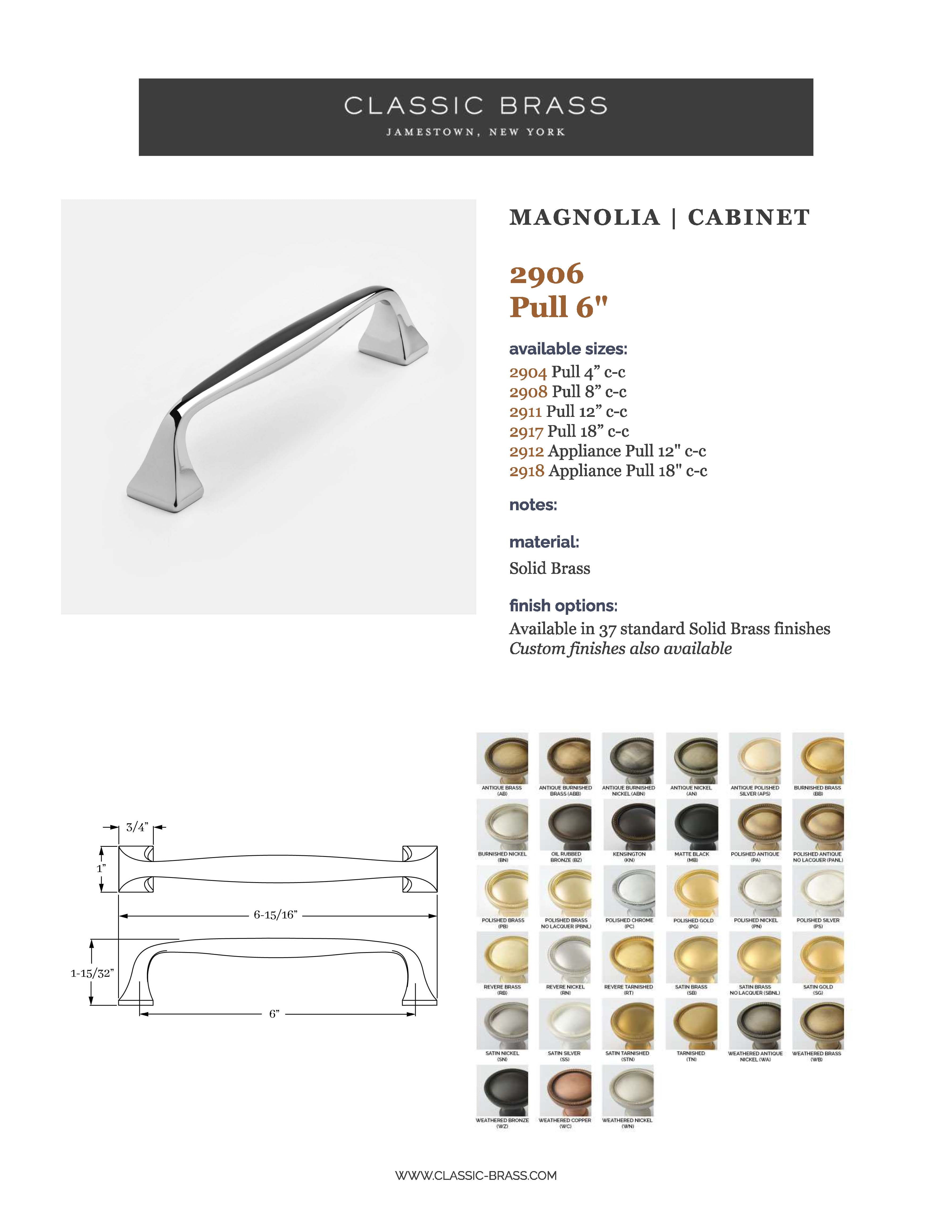 2906, Pull - 6" c-c, Classic Brass Magnolia Collection