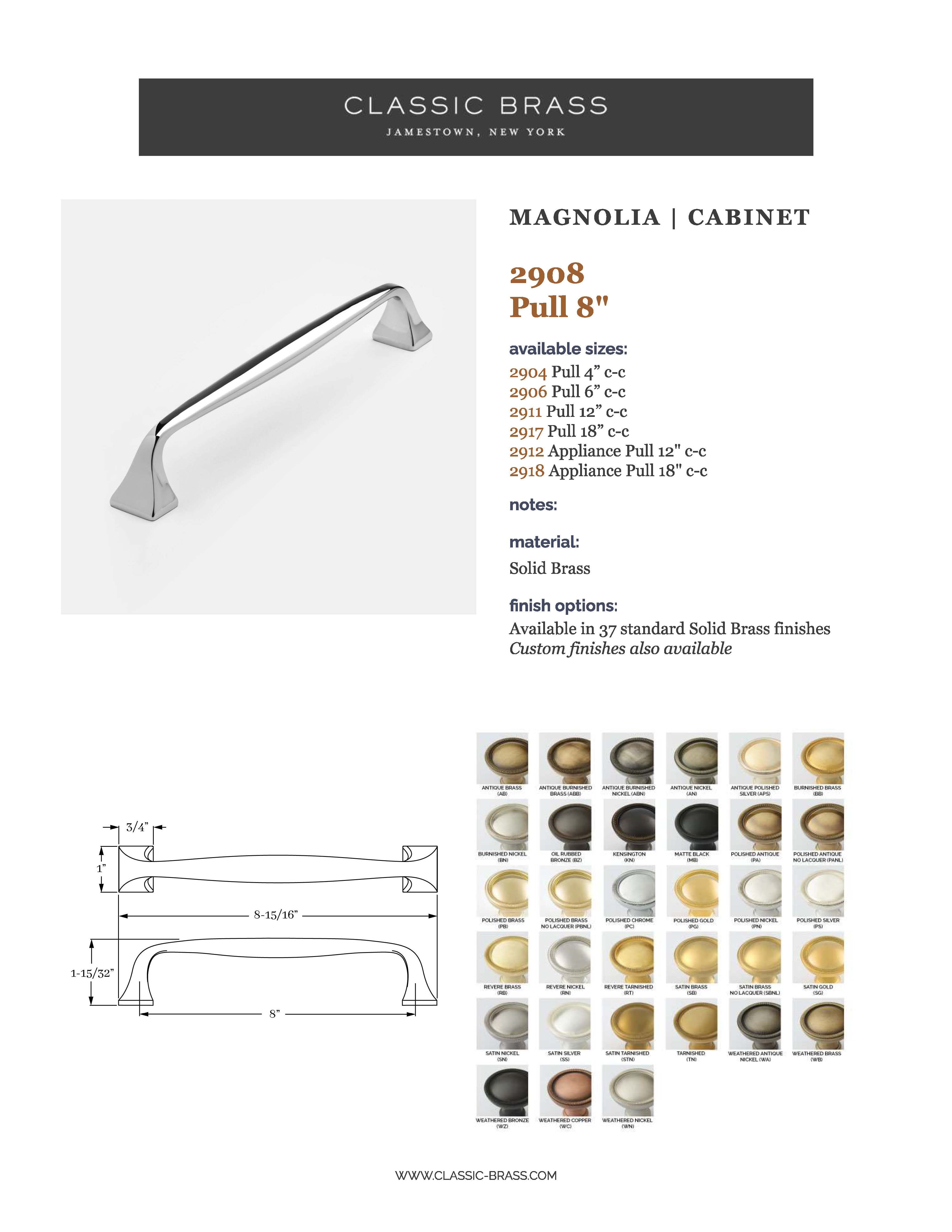 2908, Pull - 8" c-c, Classic Brass Magnolia Collection