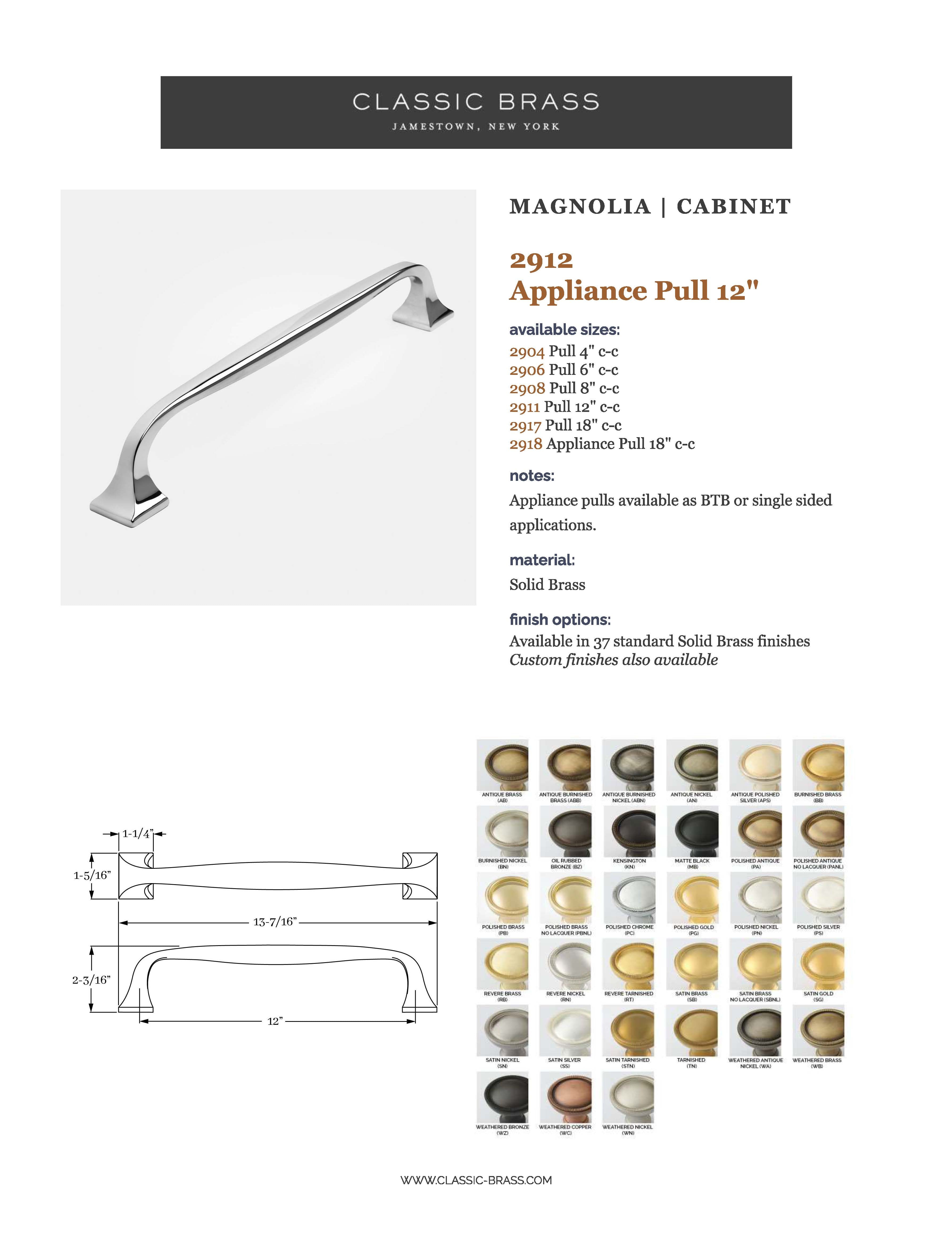 2912, Appliance Pull - 12" c-c, Classic Brass Magnolia Collection