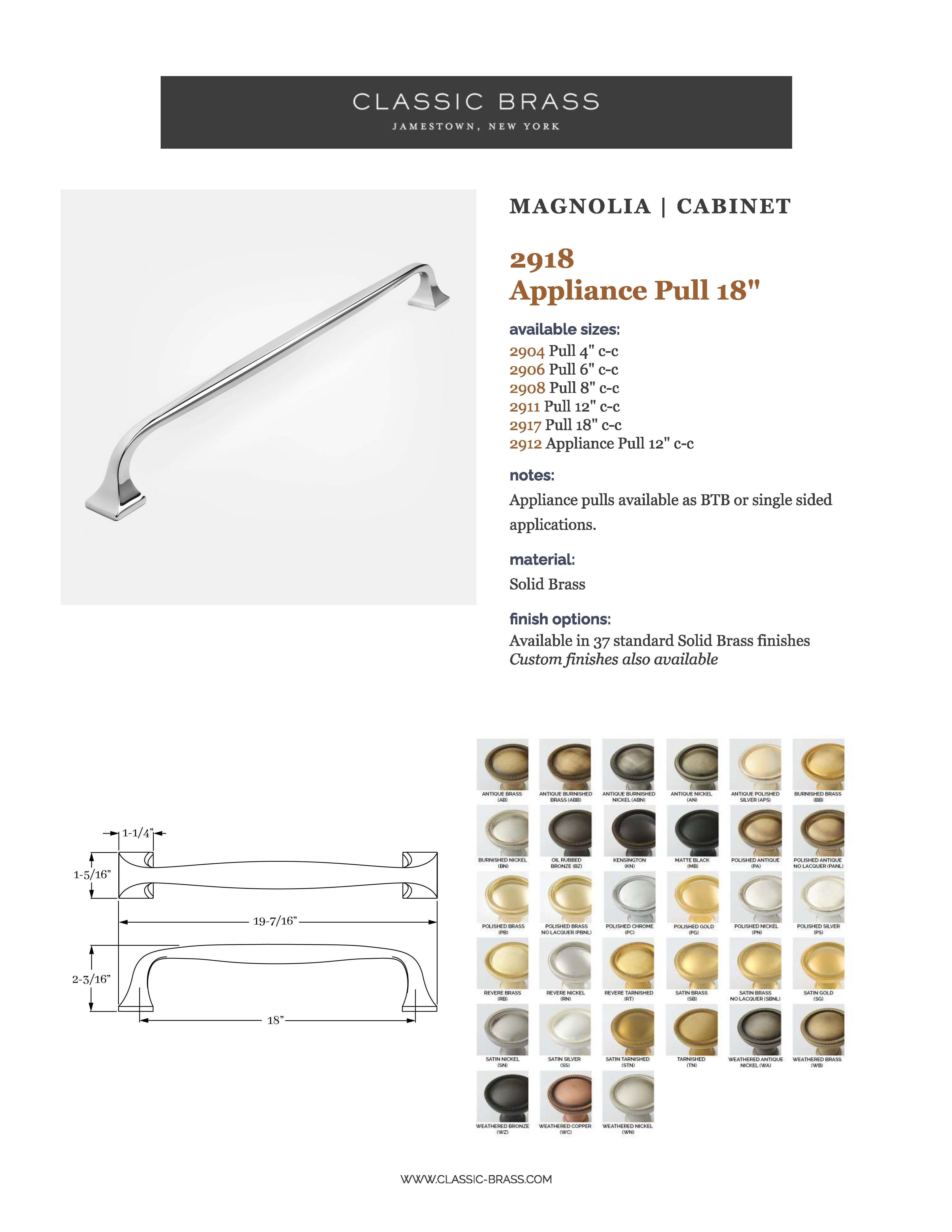 2918, Appliance Pull - 18" c-c, Classic Brass Magnolia Collection