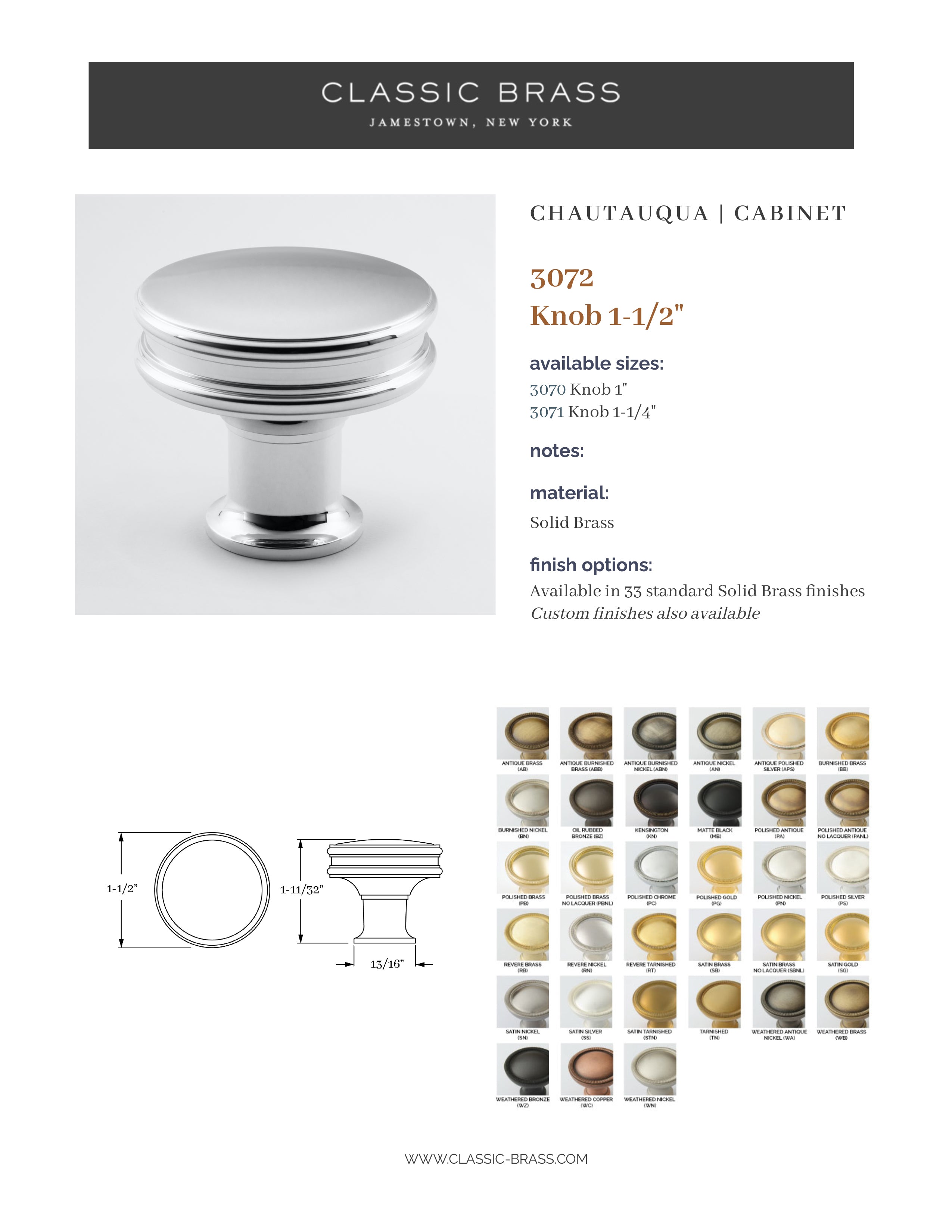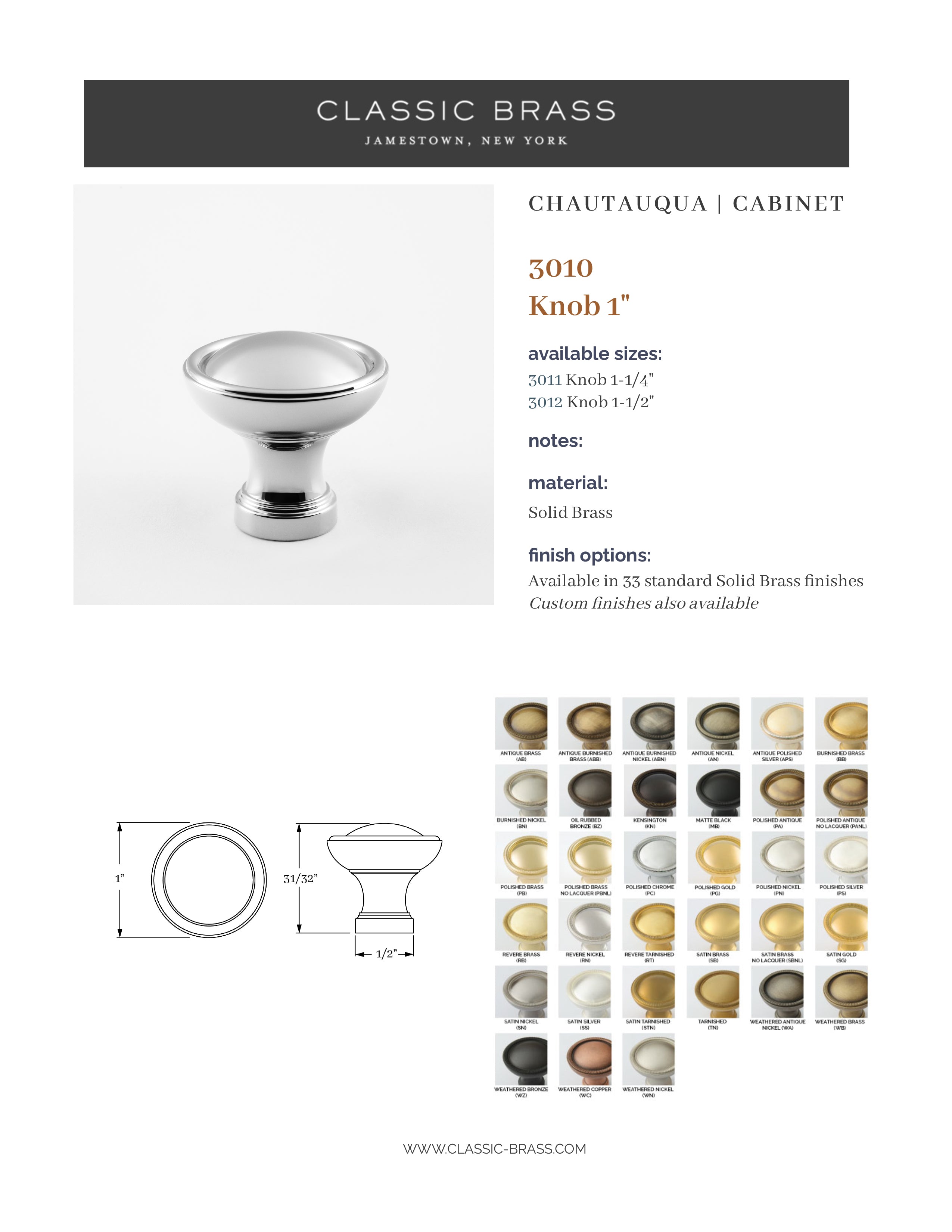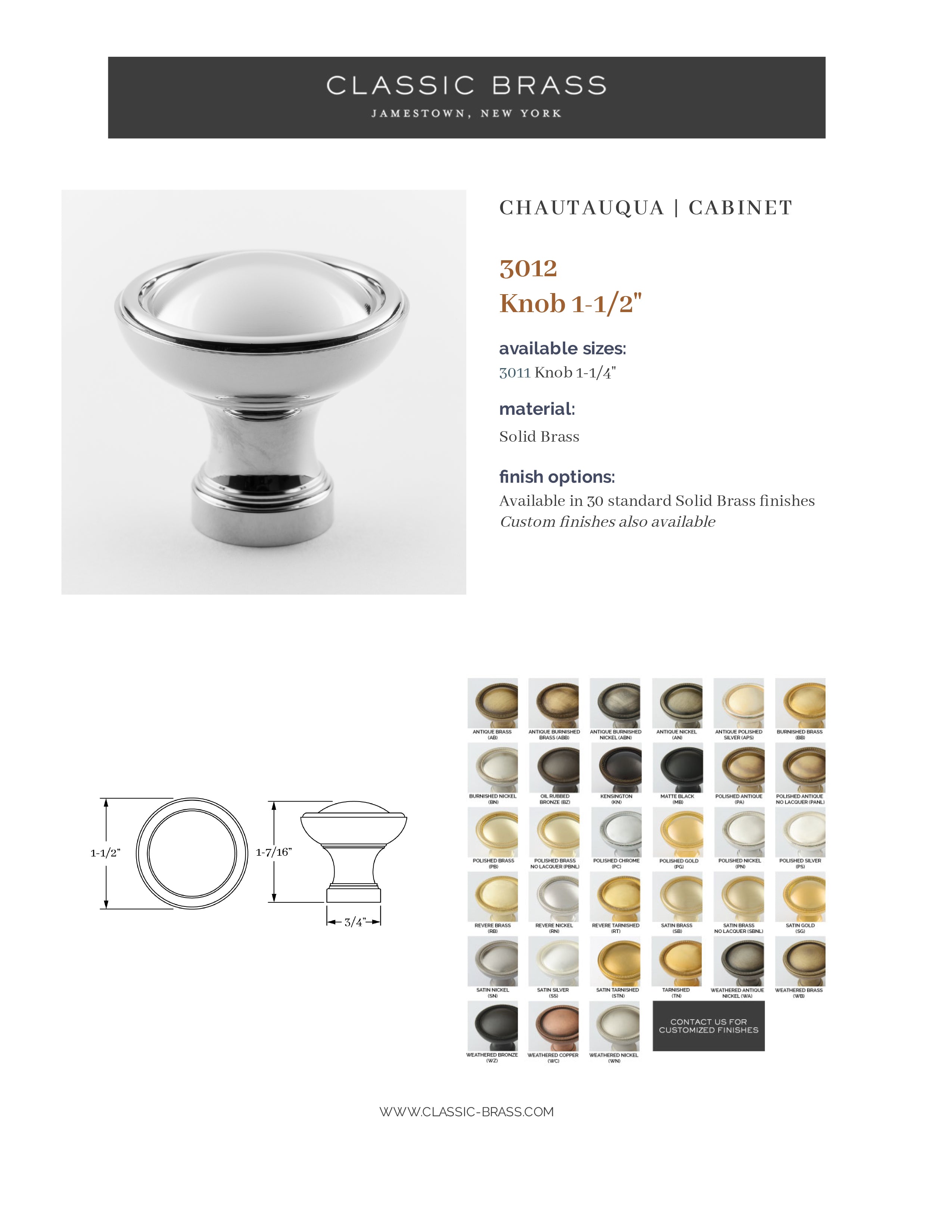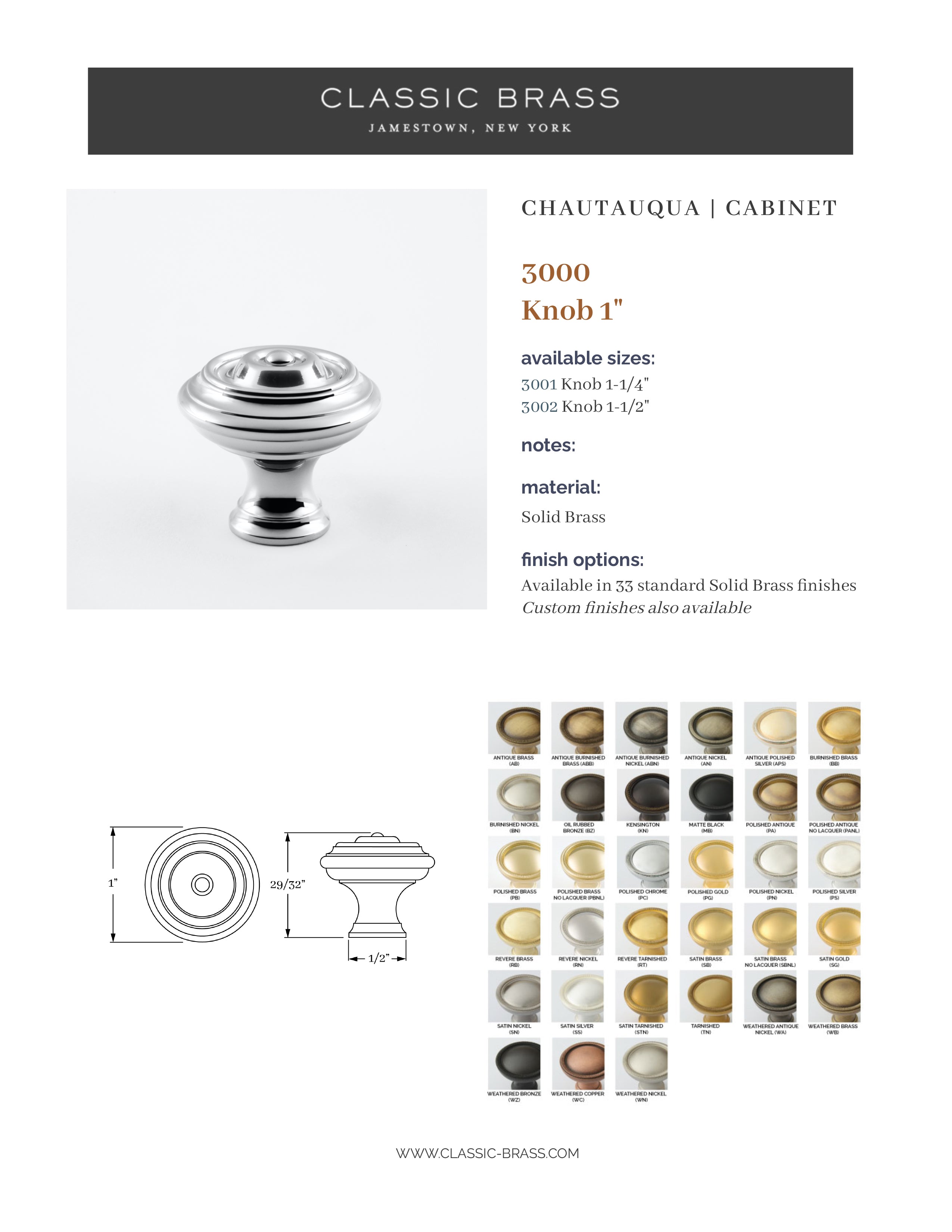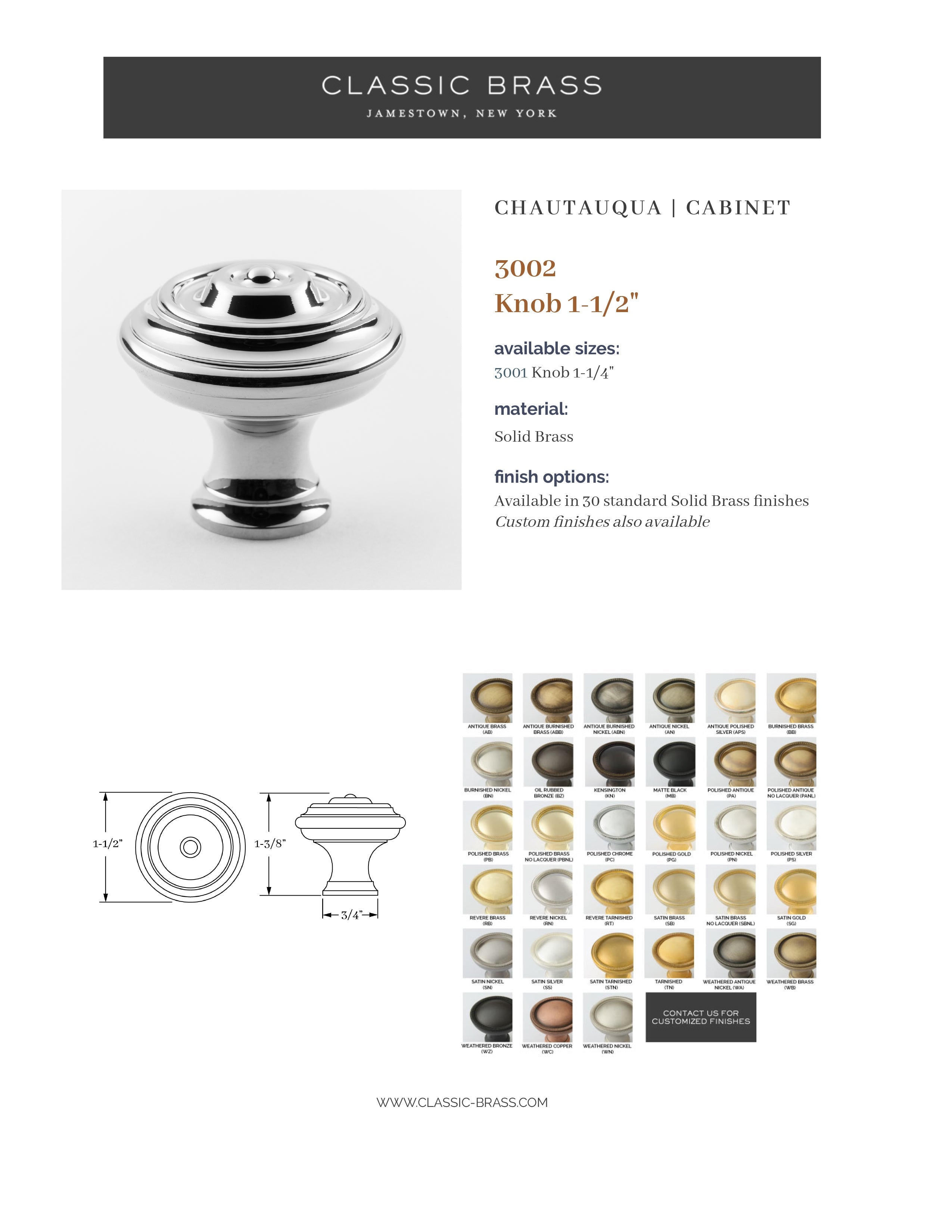 3002, Knob - 1-1/2", Classic Brass Chautauqua Collection