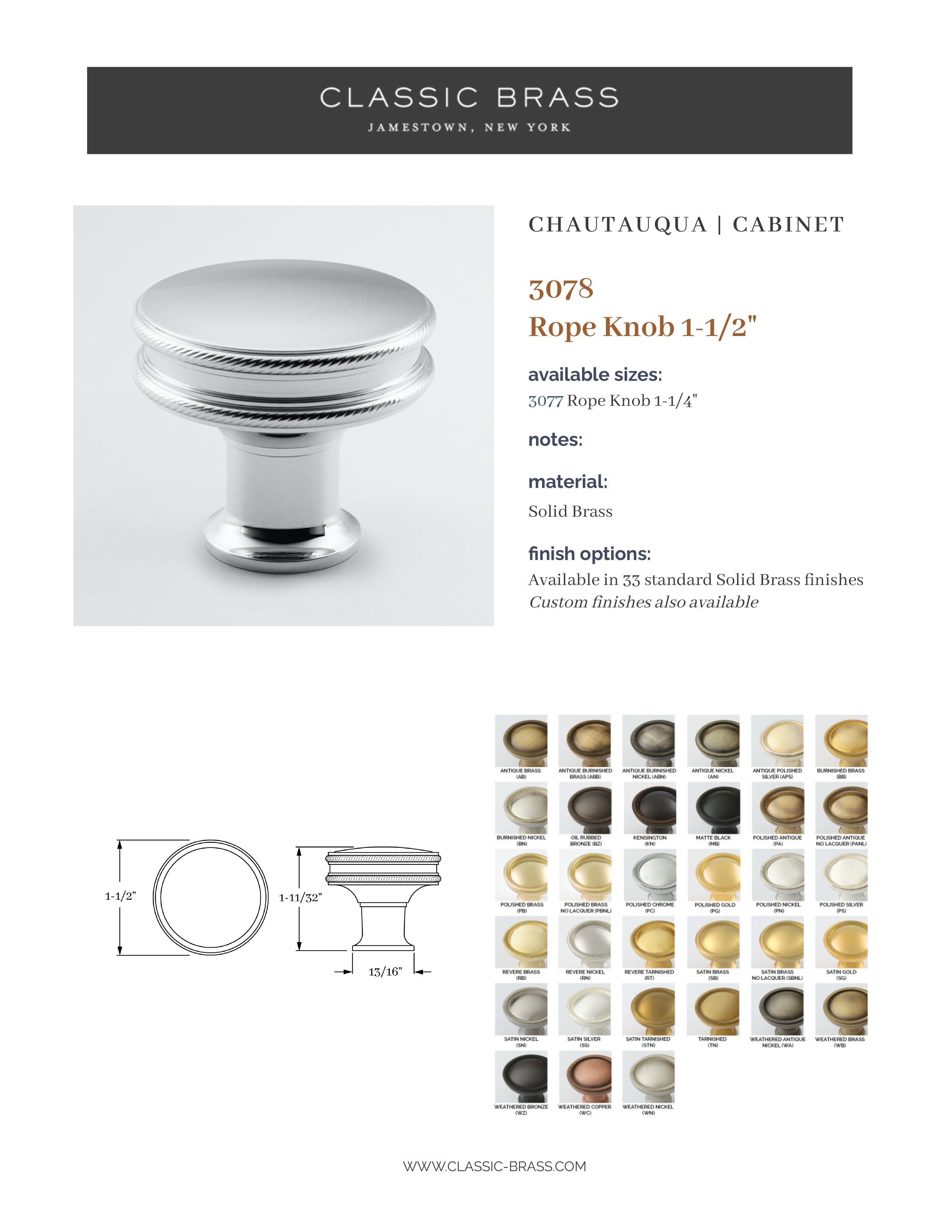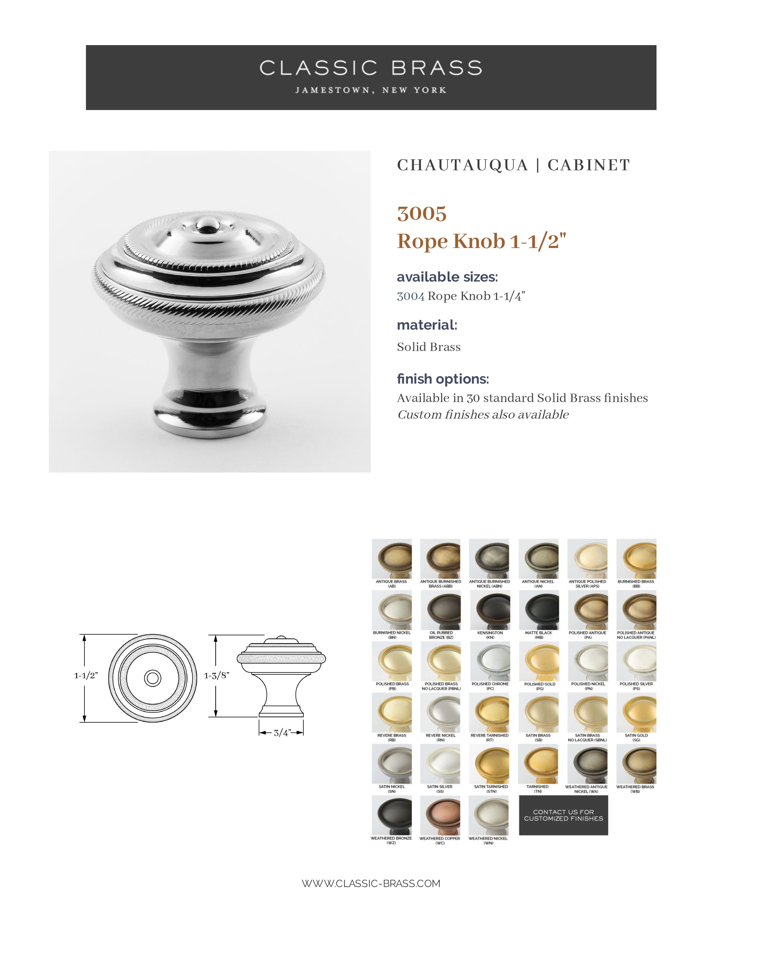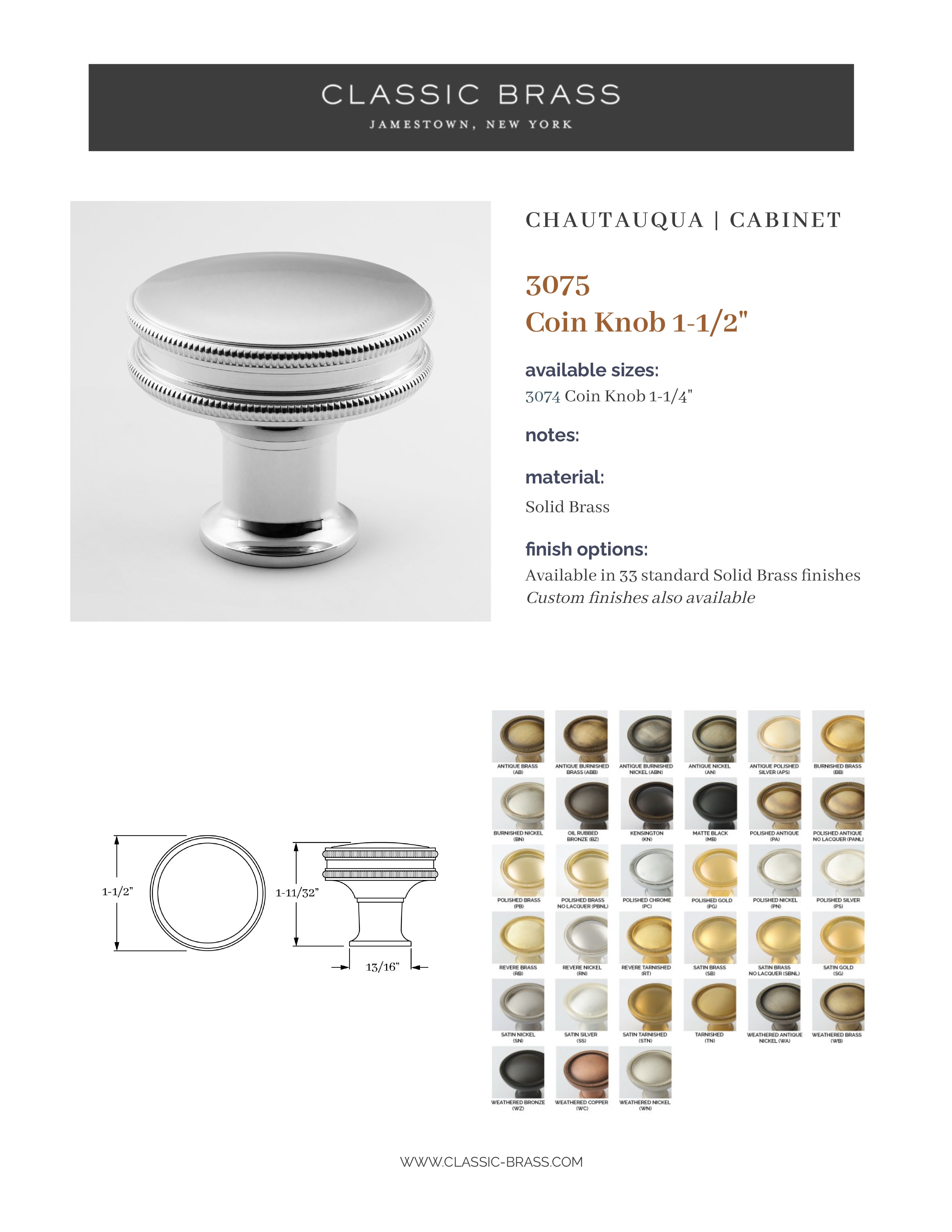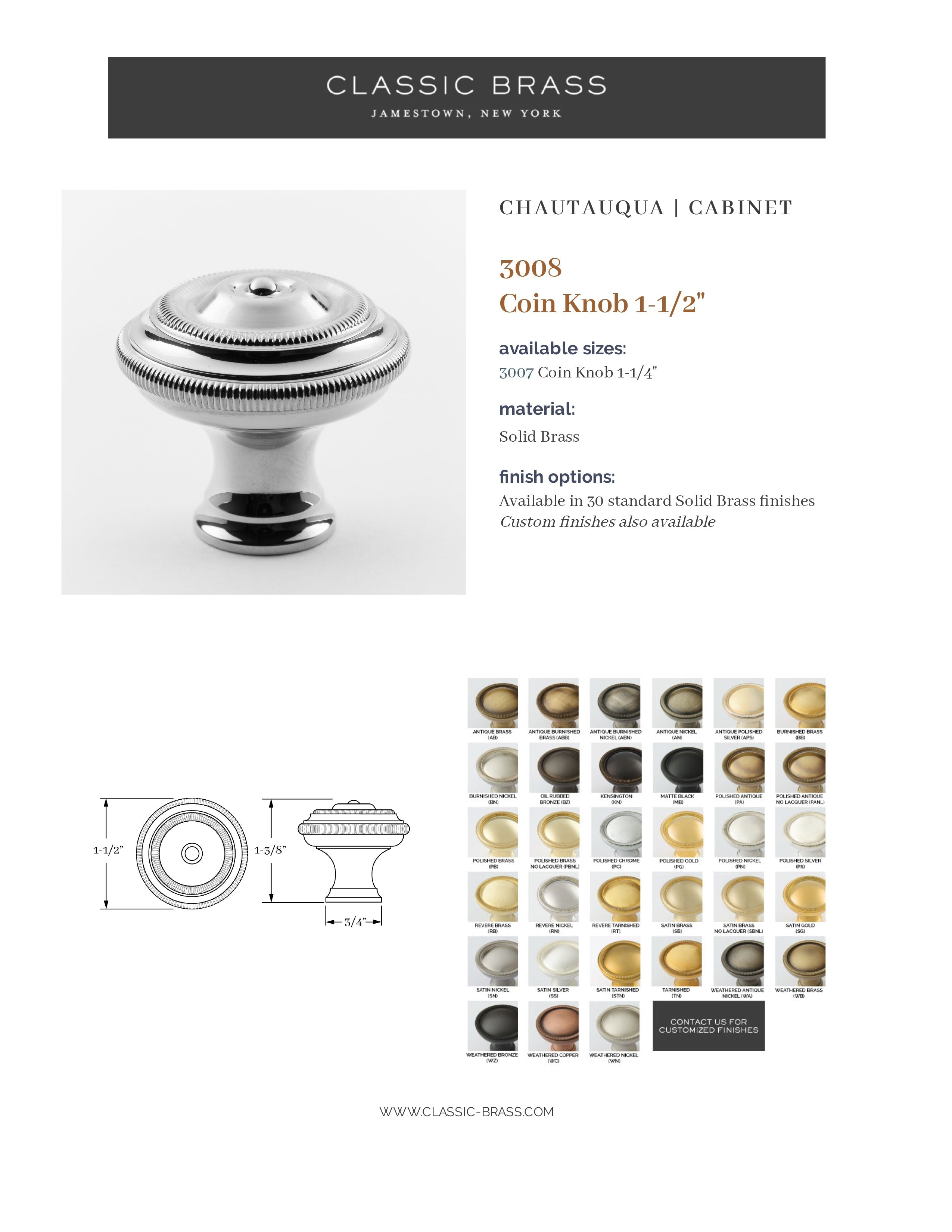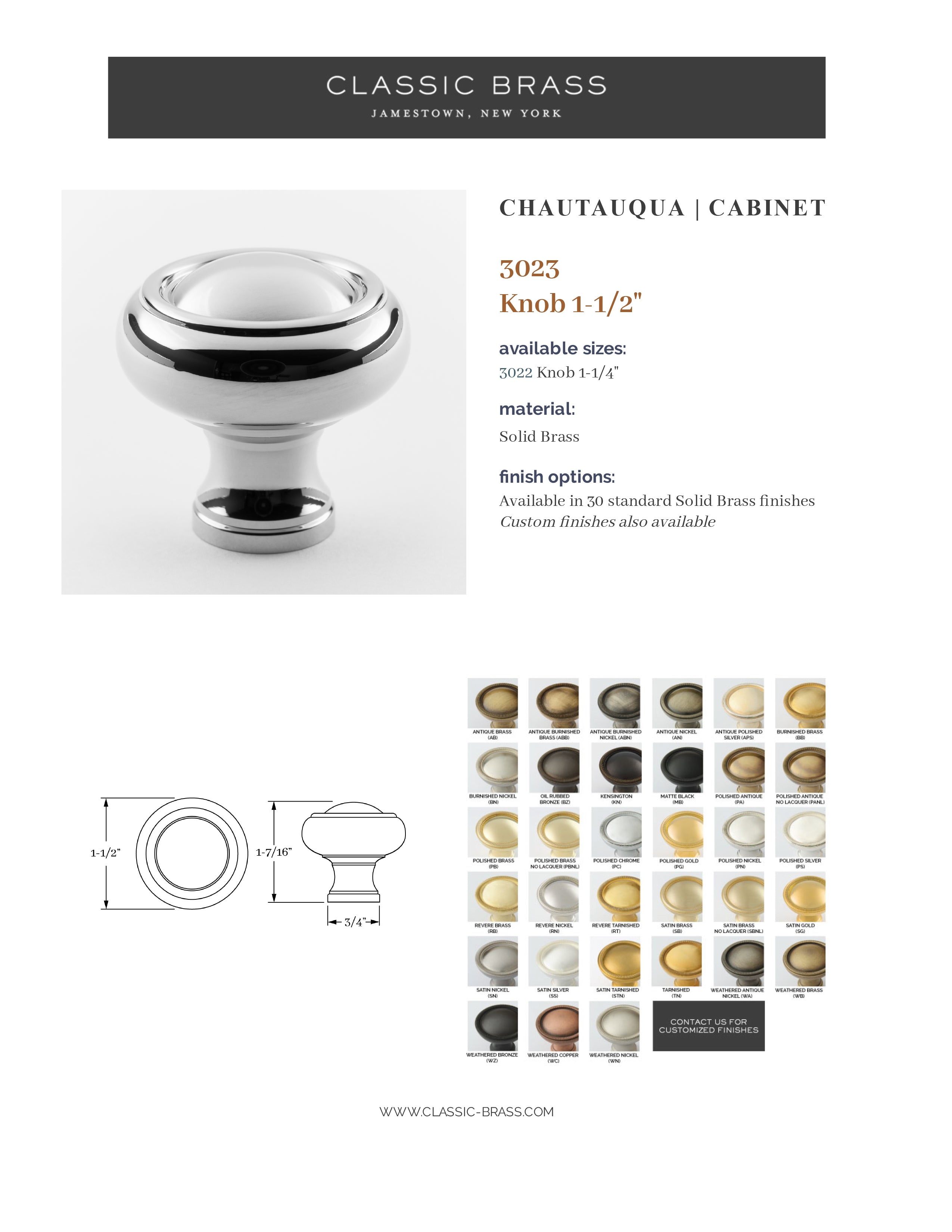 3002, Knob - 1-1/2", Classic Brass Chautauqua Collection
