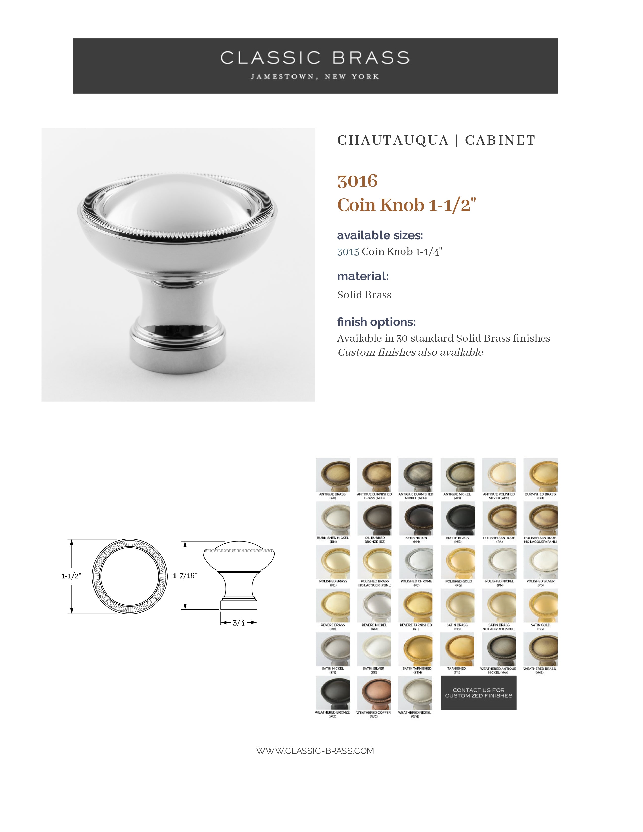 3016, Knob - 1-1/2" Coin, Classic Brass Chautauqua Collection