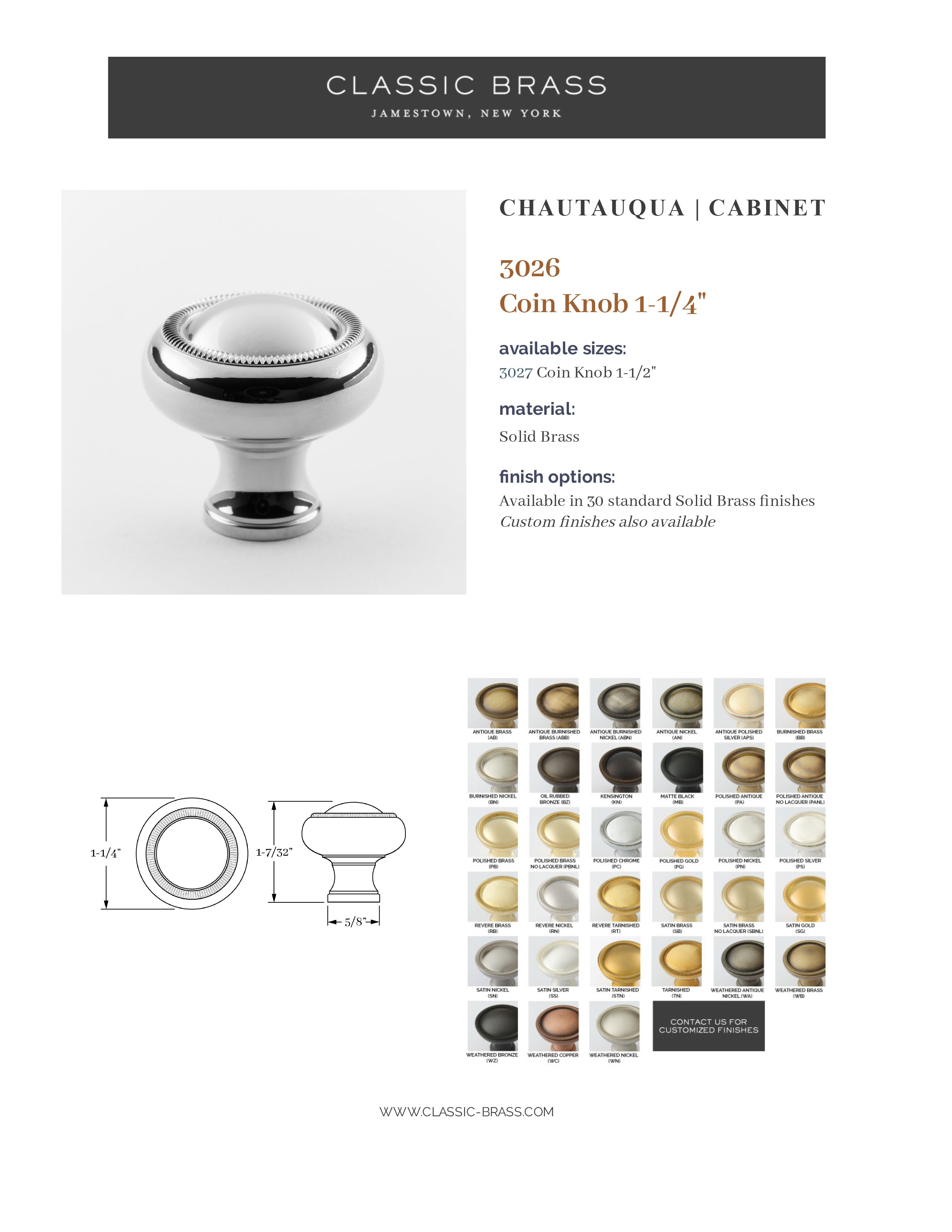 3026, Knob - 1-1/4" Coin, Classic Brass Chautauqua Collection