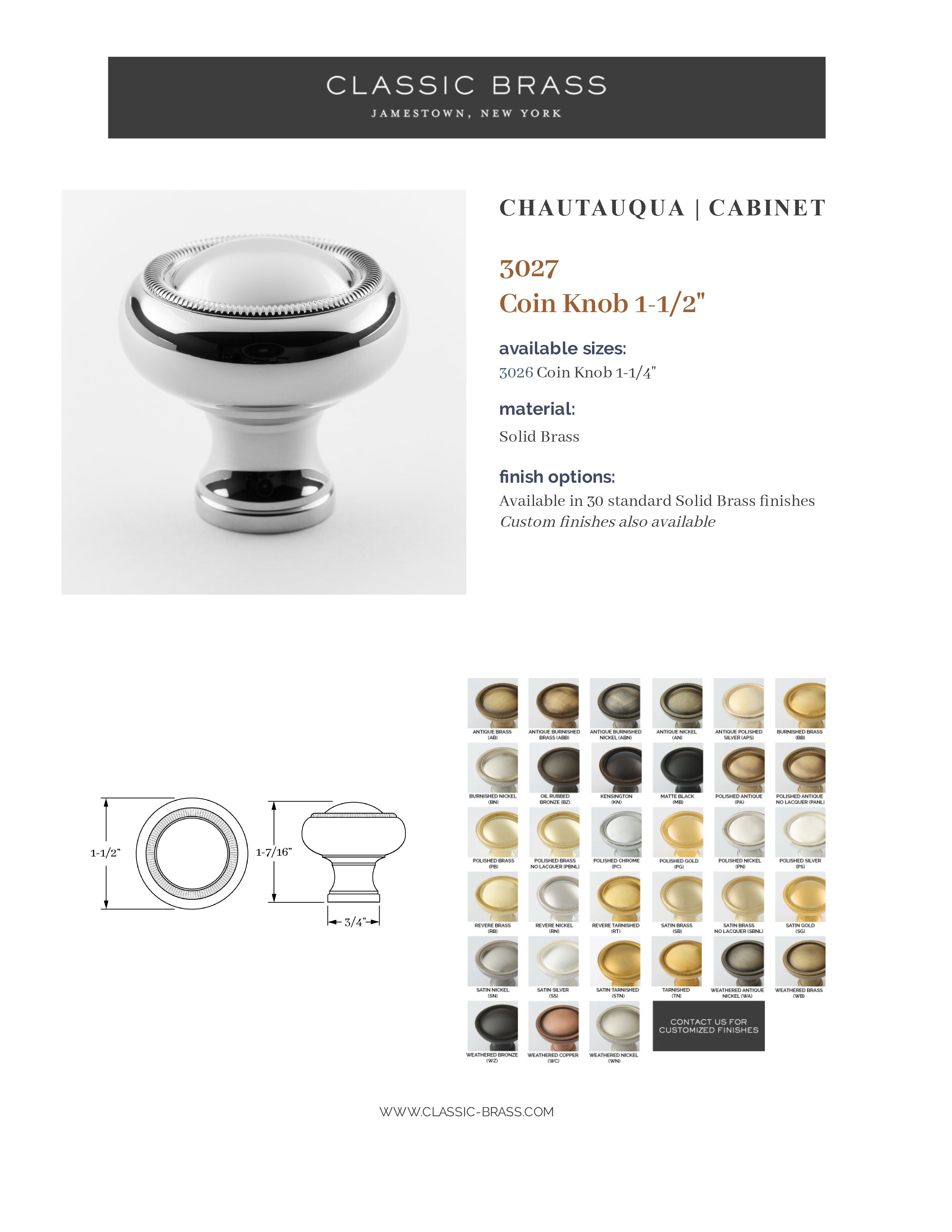 3027, Knob - 1-1/2" Coin, Classic Brass Chautauqua Collection