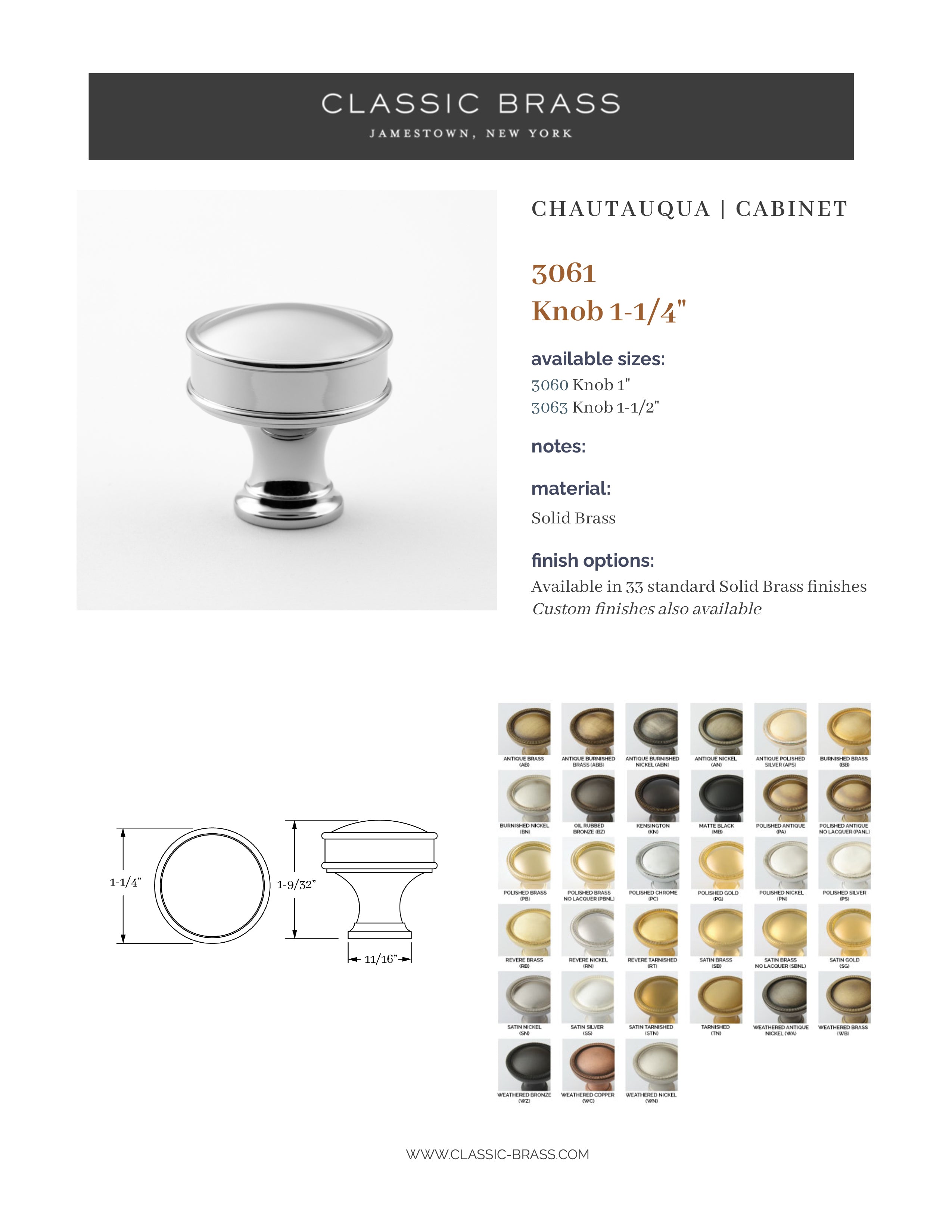 3061, Knob - 1-1/4", Classic Brass Chautauqua Collection