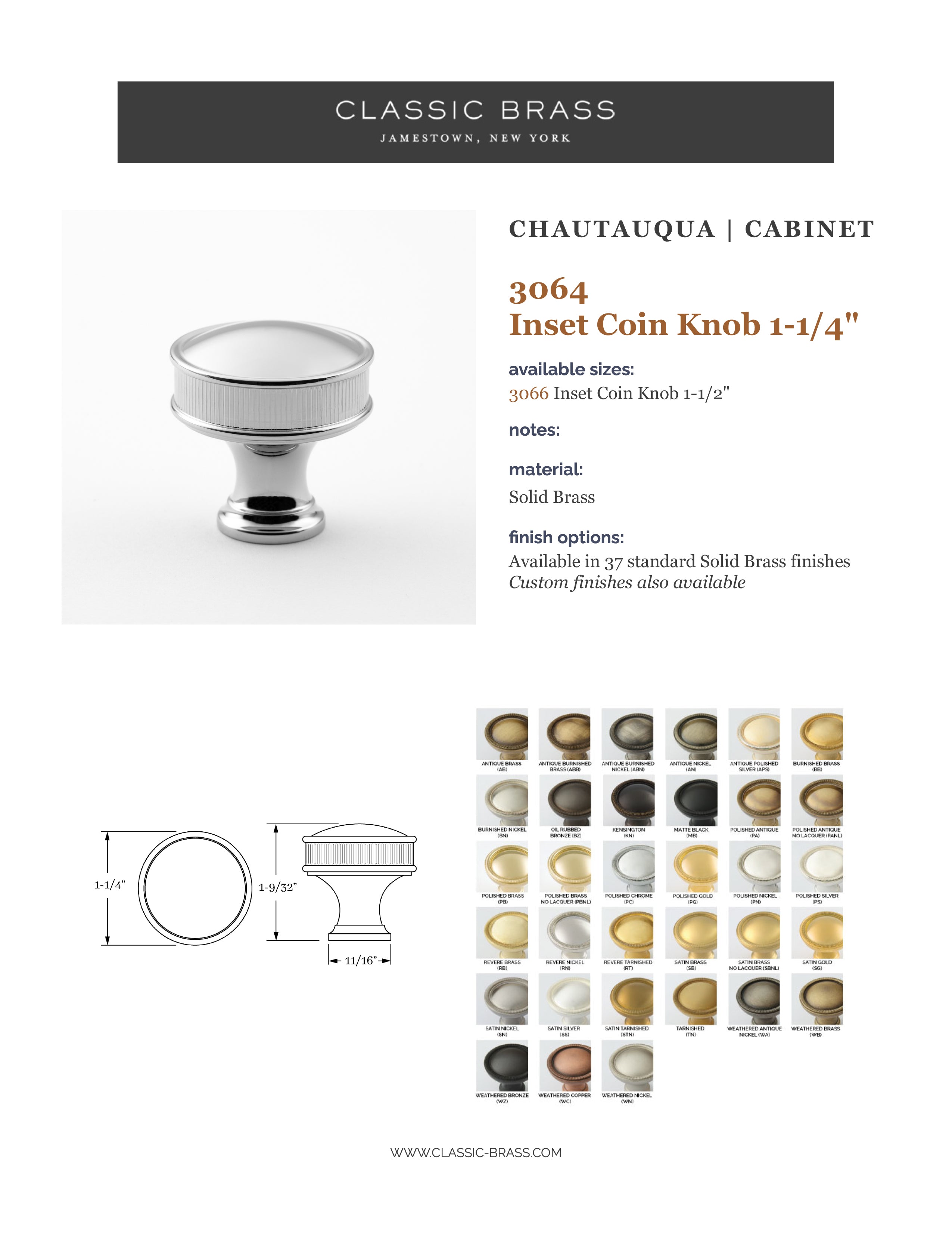 3064, Knob - 1-1/4" Inset Coin, Classic Brass Chautauqua Collection