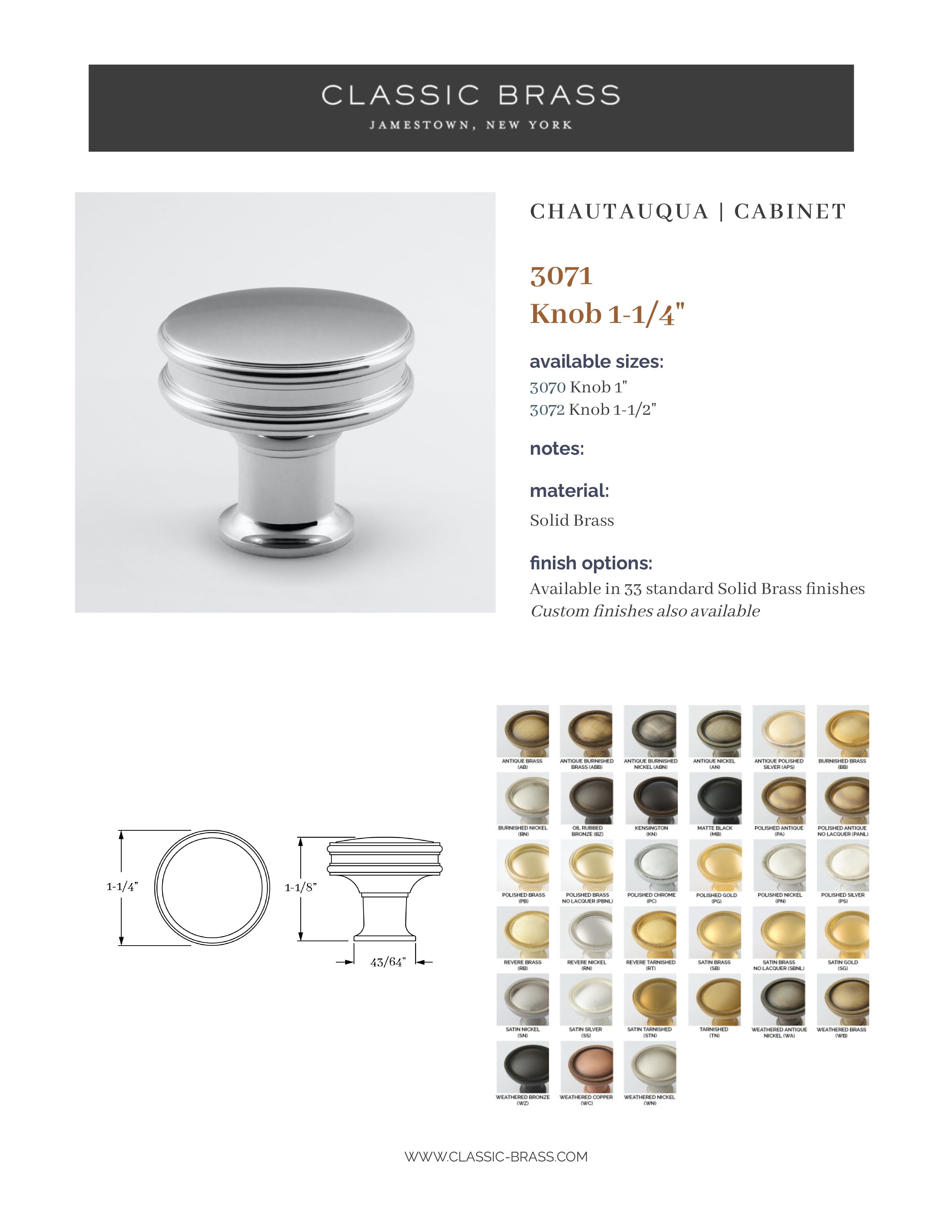 3071, Knob - 1-1/4", Classic Brass Chautauqua Collection
