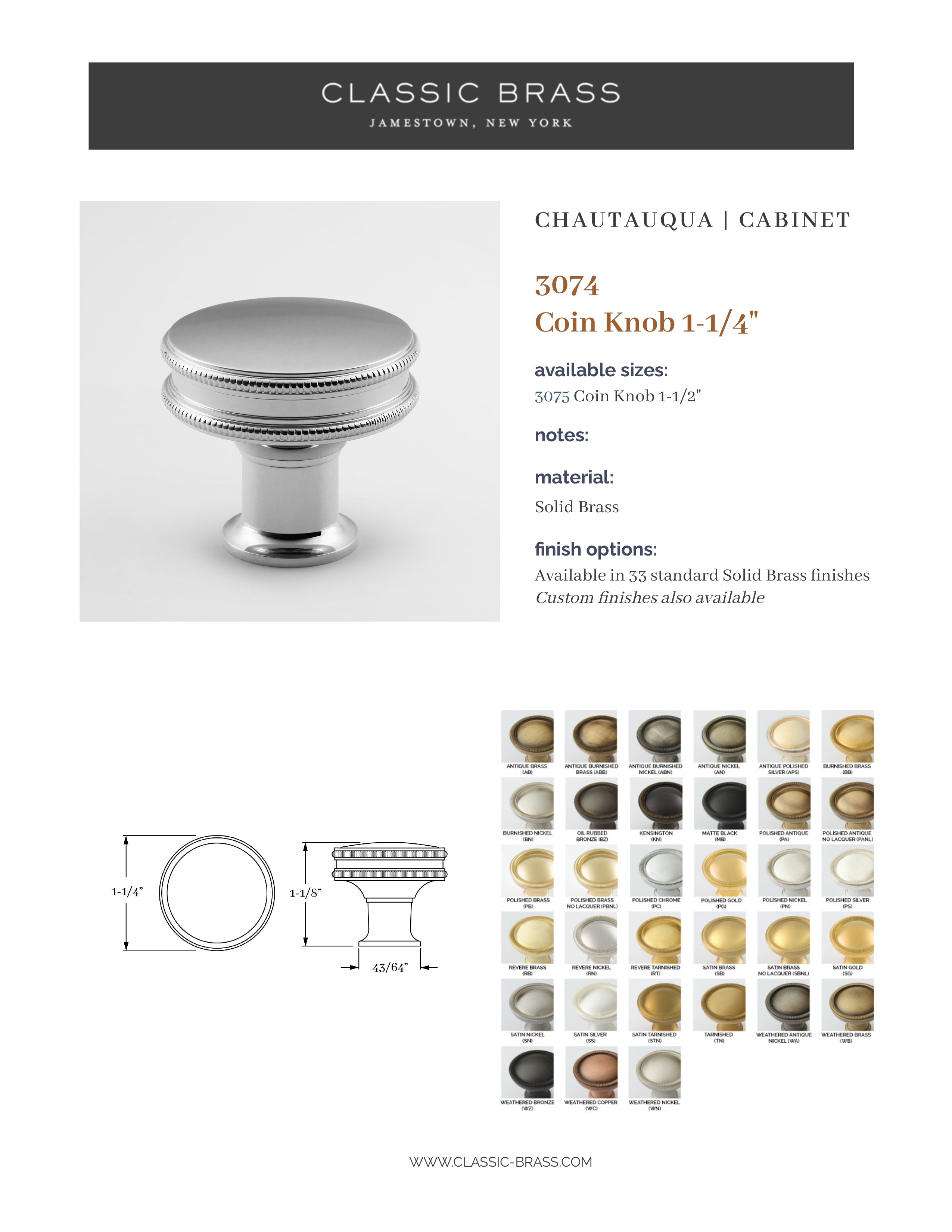 3074, Knob - Coin - 1-1/4", Classic Brass Chautauqua Collection