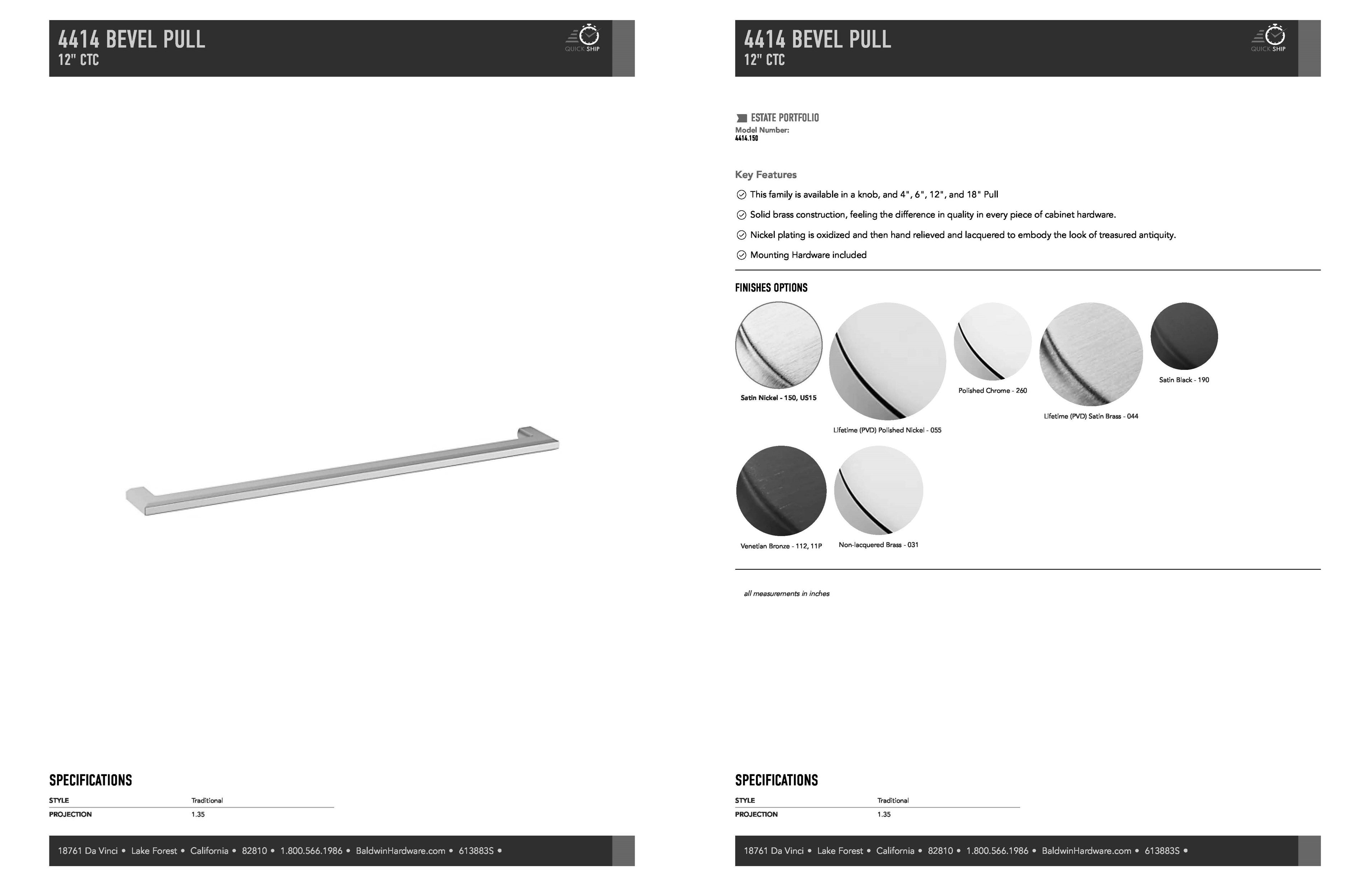 4414, Bevel Pull - 12"CTC x 1.35" p., BH Bevel Collection