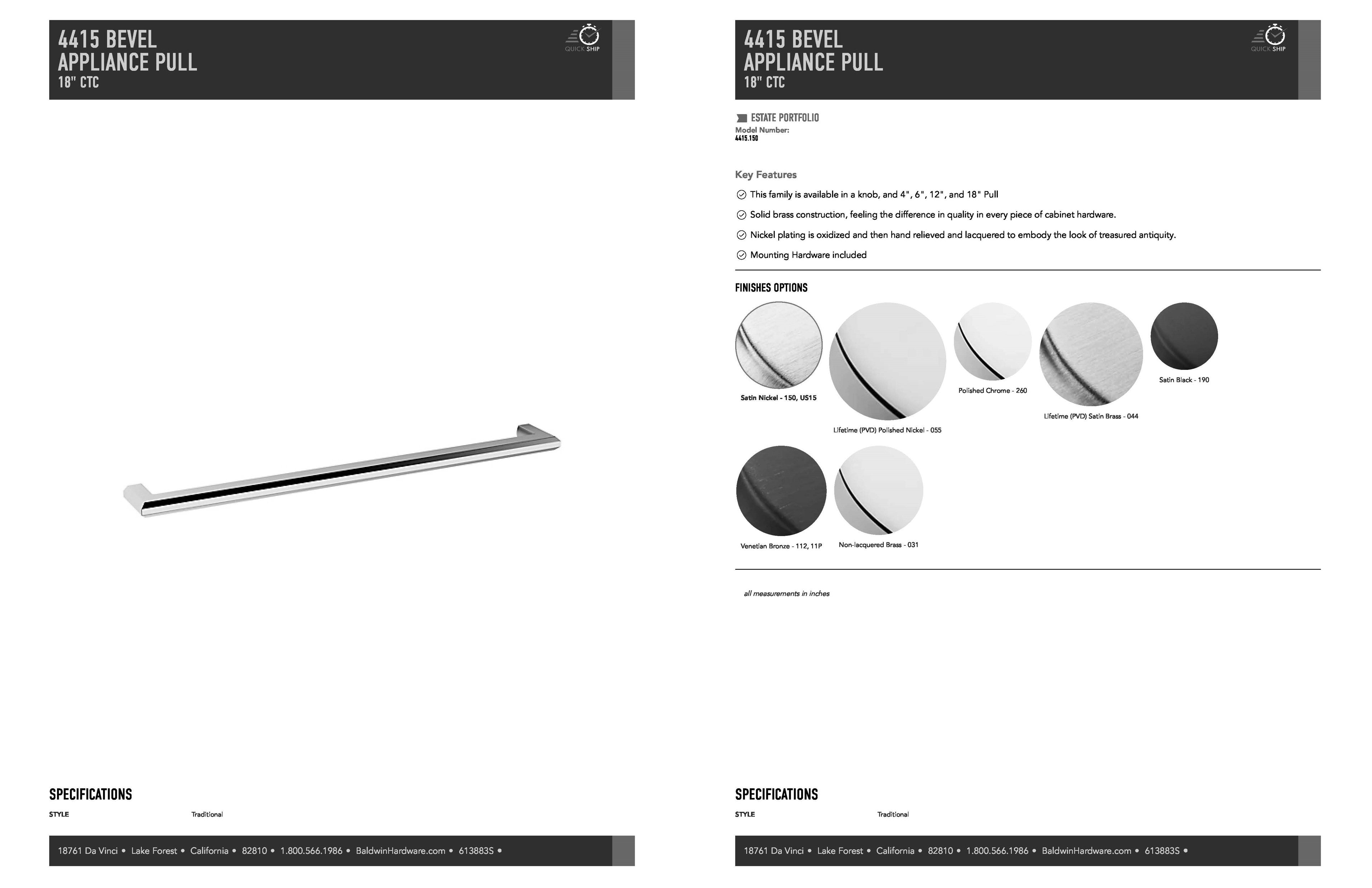 4415, Bevel Appliance Pull - 18" CTC, BH Bevel Collection