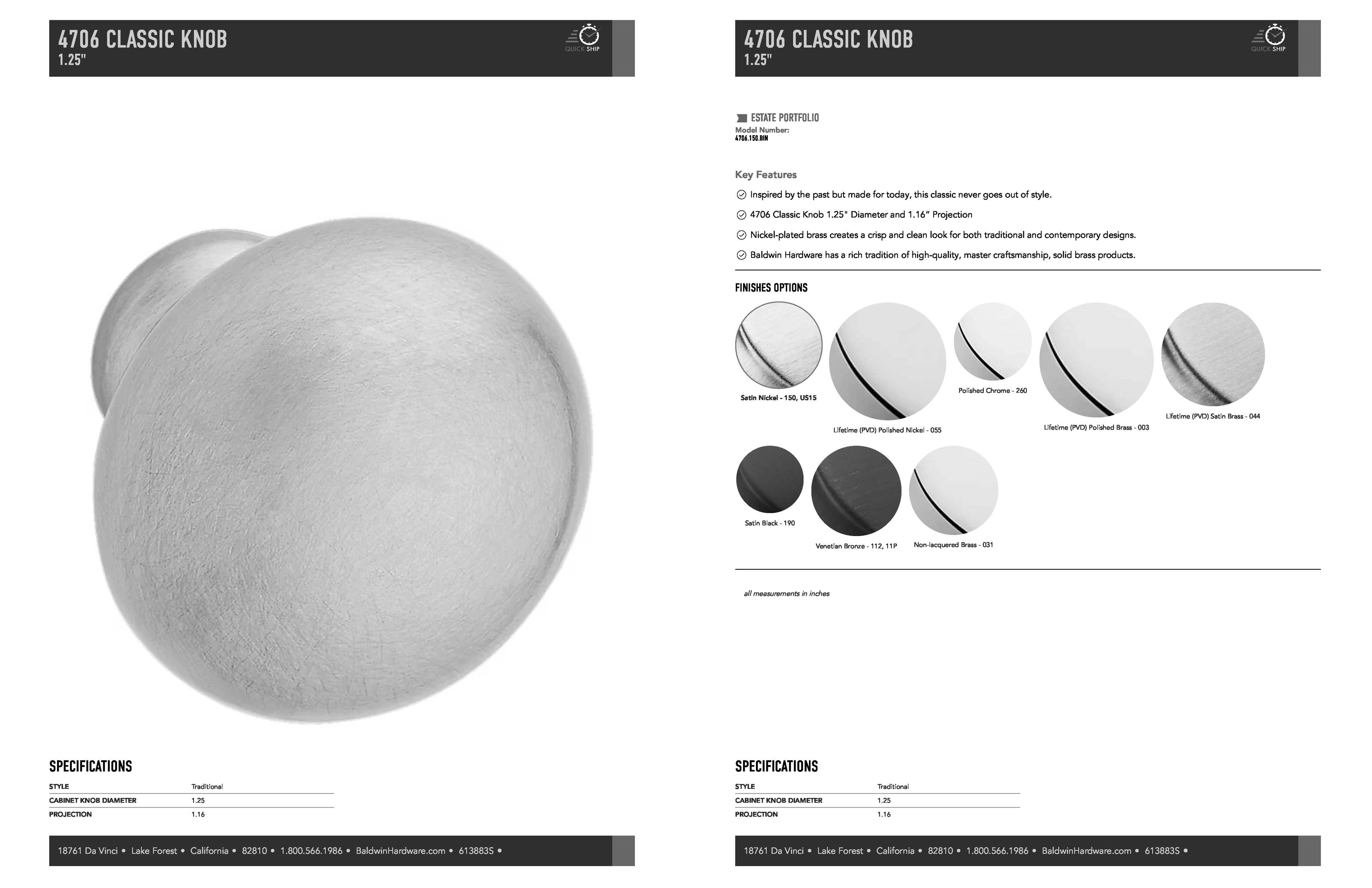 4706, Classic Knob - 1.25" d. x 1.157" p., BH