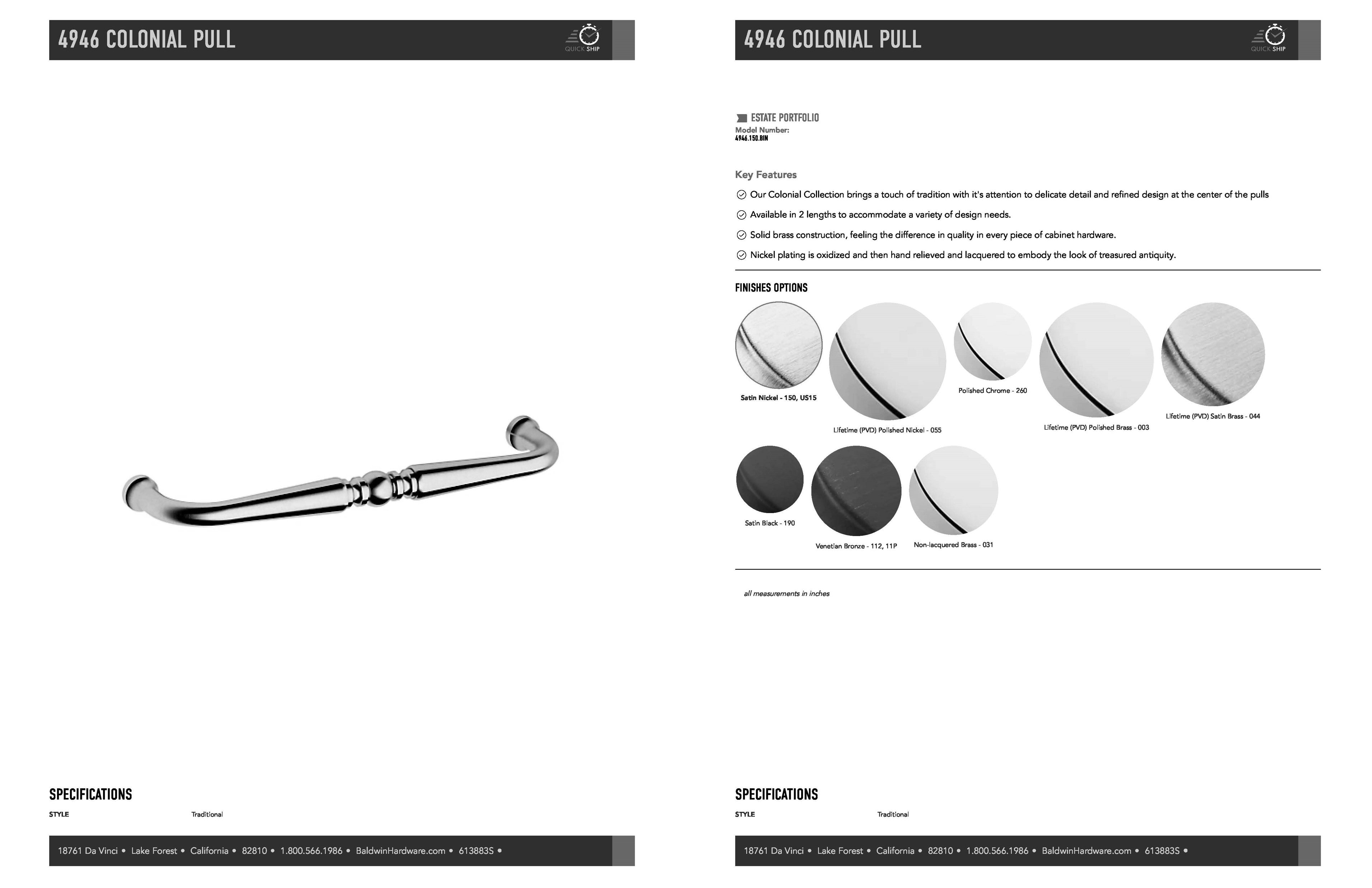 4946, Colonial Pull - 6" CTC x 1.6" p., BH