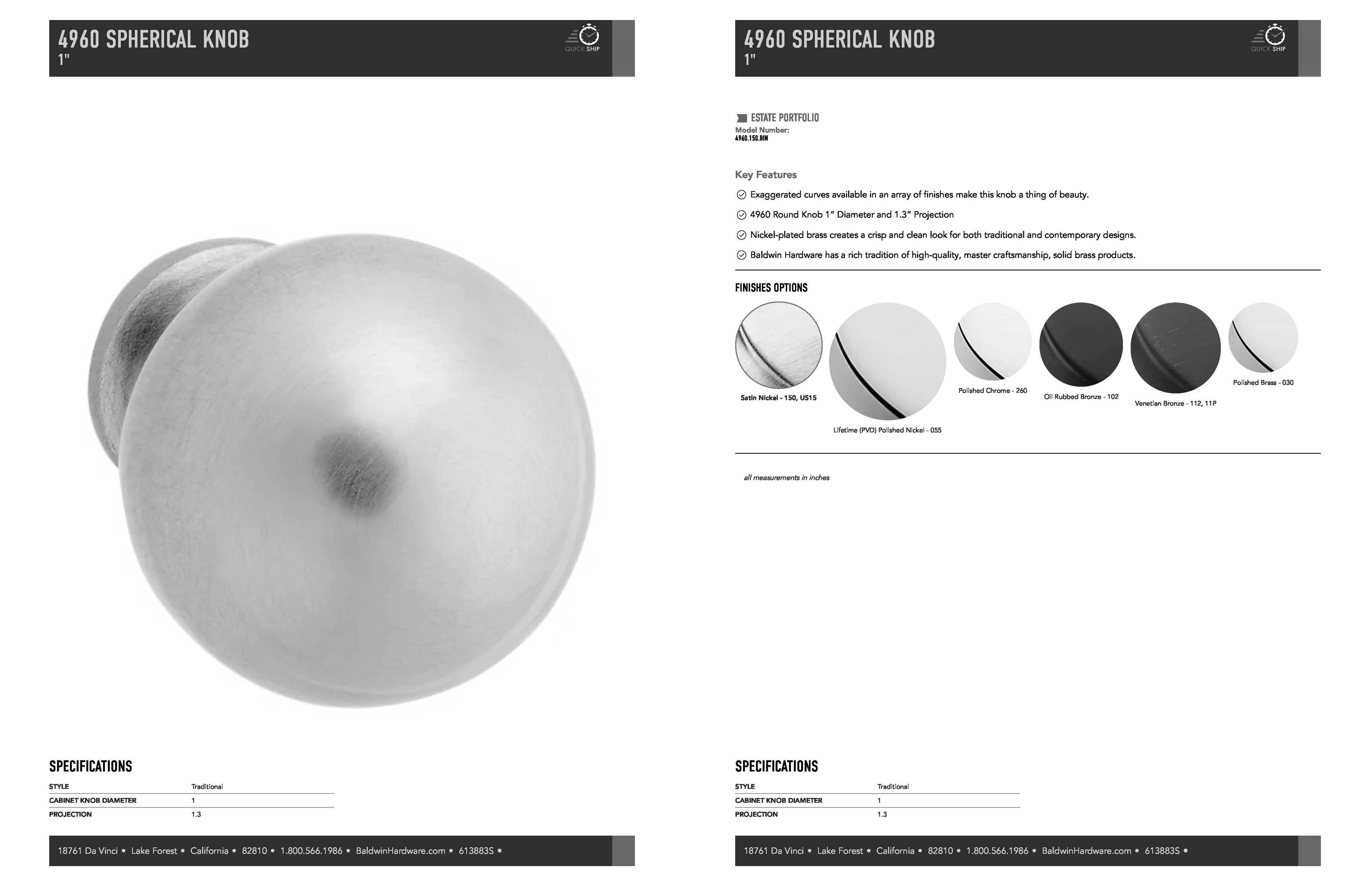 4960, Spherical Knob - 1" d. x 1.312" p., BH