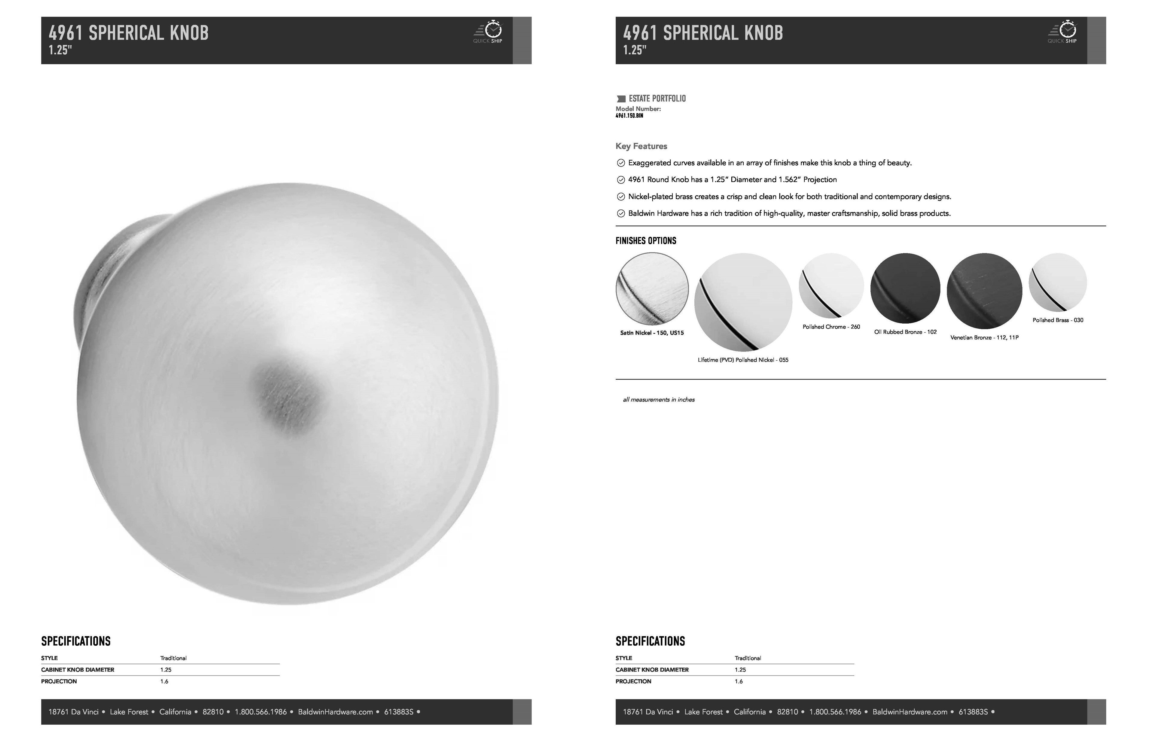 4961, Spherical Knob - 1.25" d. x 1.562" p., BH